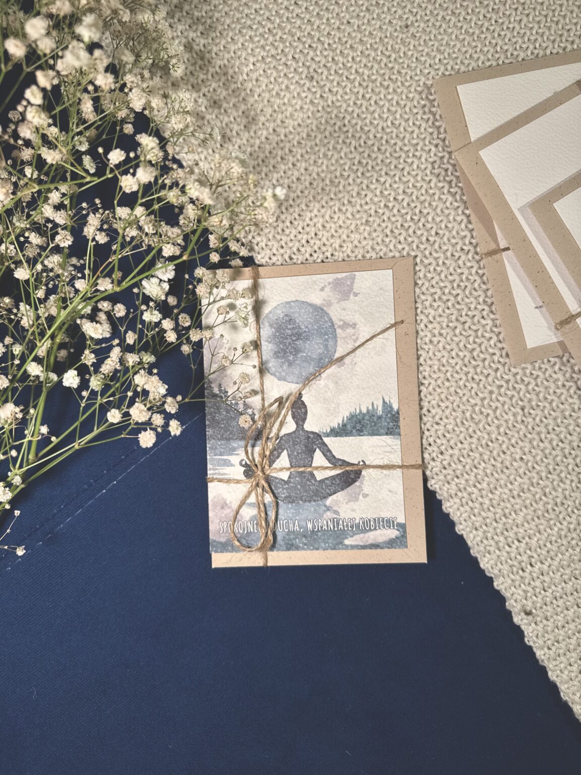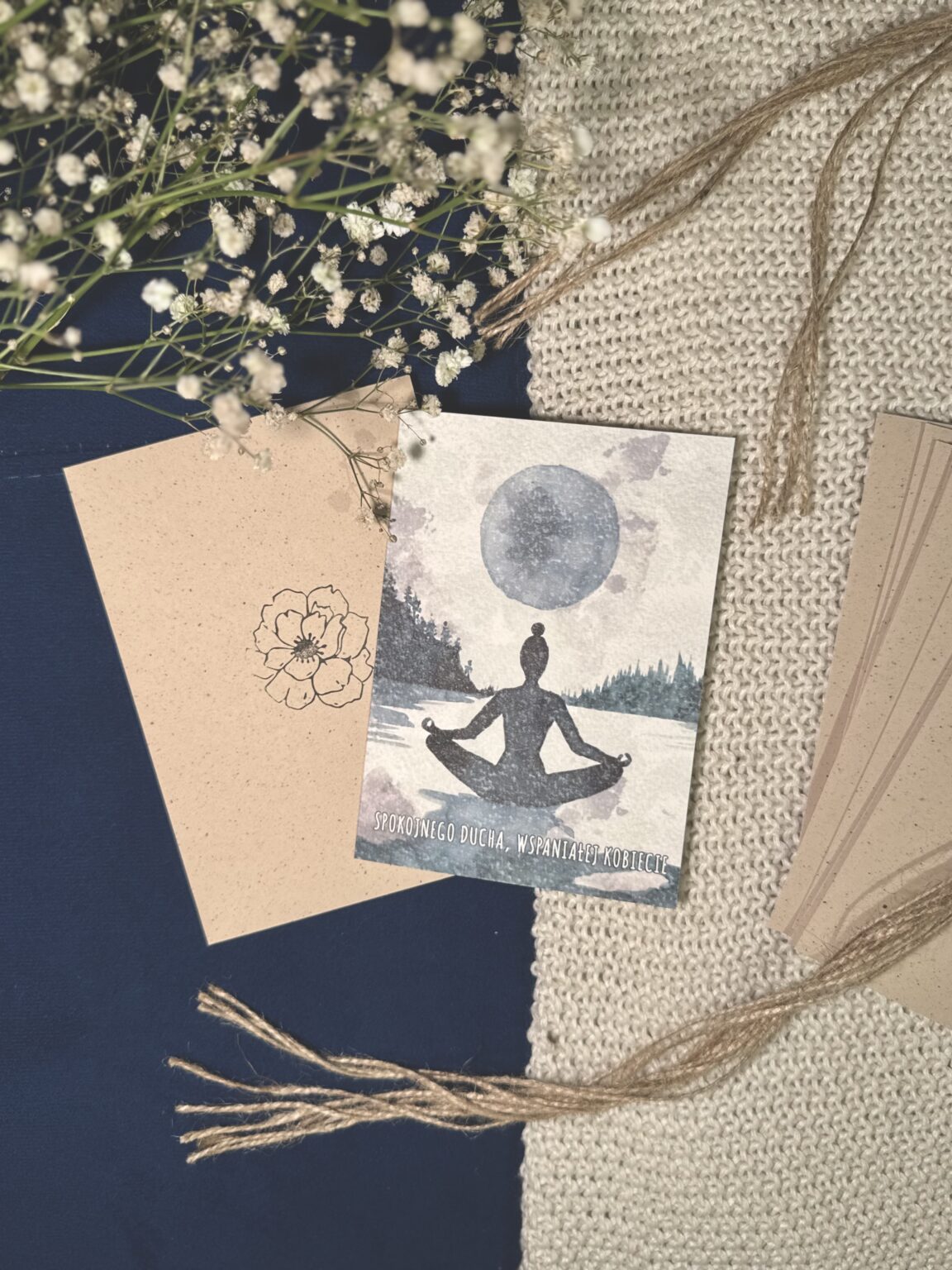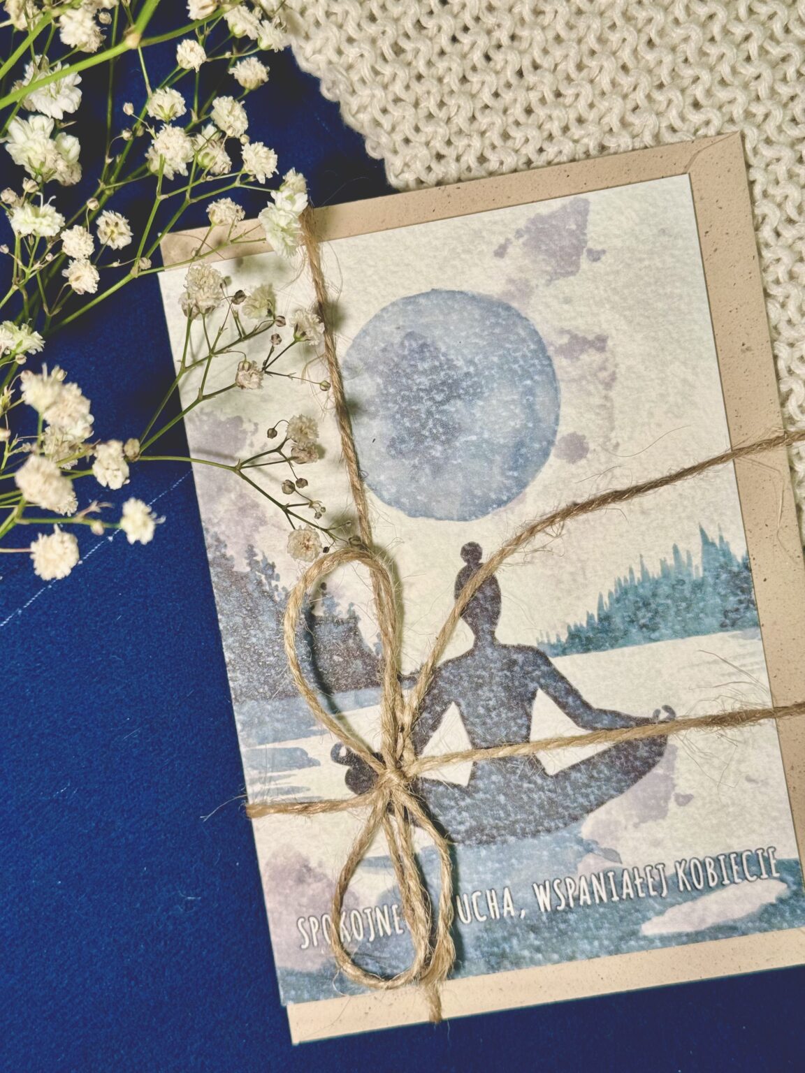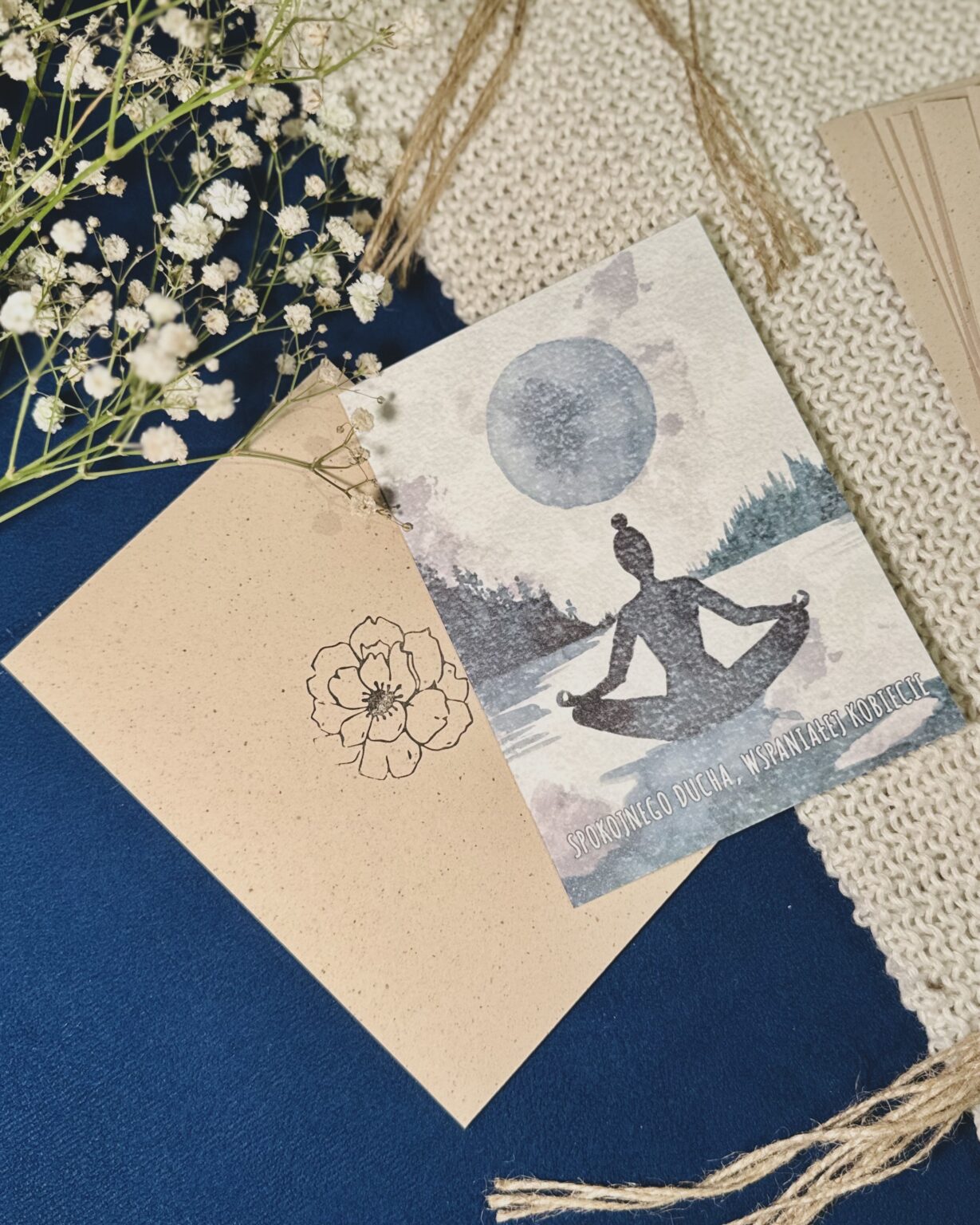 Kartka na Dzień Kobiet „Spokojnego ducha, wspaniałej kobiecie” to minimalistyczna, monochromatyczna kompozycja z postacią medytującą nad jeziorem, wśród drzew i ciszy. To subtelna forma życzeń dla kobiety, która ceni harmonię, wewnętrzny spokój i siłę płynącą z natury. Idealna dla joginki, marzycielki, introwertyczki — dla każdej, która szuka równowagi i głębi.