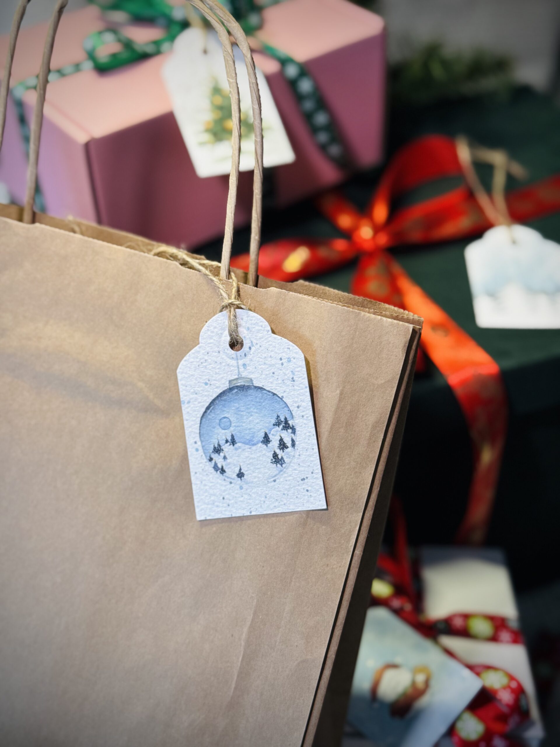 Etykietka prezentowa „Śnieżna bombka” dodaje prezentom odrobinę świątecznej magii i elegancji. Ilustracja bombki przypominającej maleńką śnieżną kulę z zimowym pejzażem wewnątrz tworzy wyjątkowy, nastrojowy efekt. Dzięki sznureczkowi i delikatnej formie etykietka idealnie nadaje się do podpisania prezentów, czyniąc je jeszcze bardziej osobistymi i dopracowanymi. To subtelny detal, który pięknie dopełni każdą paczkę pod choinką.