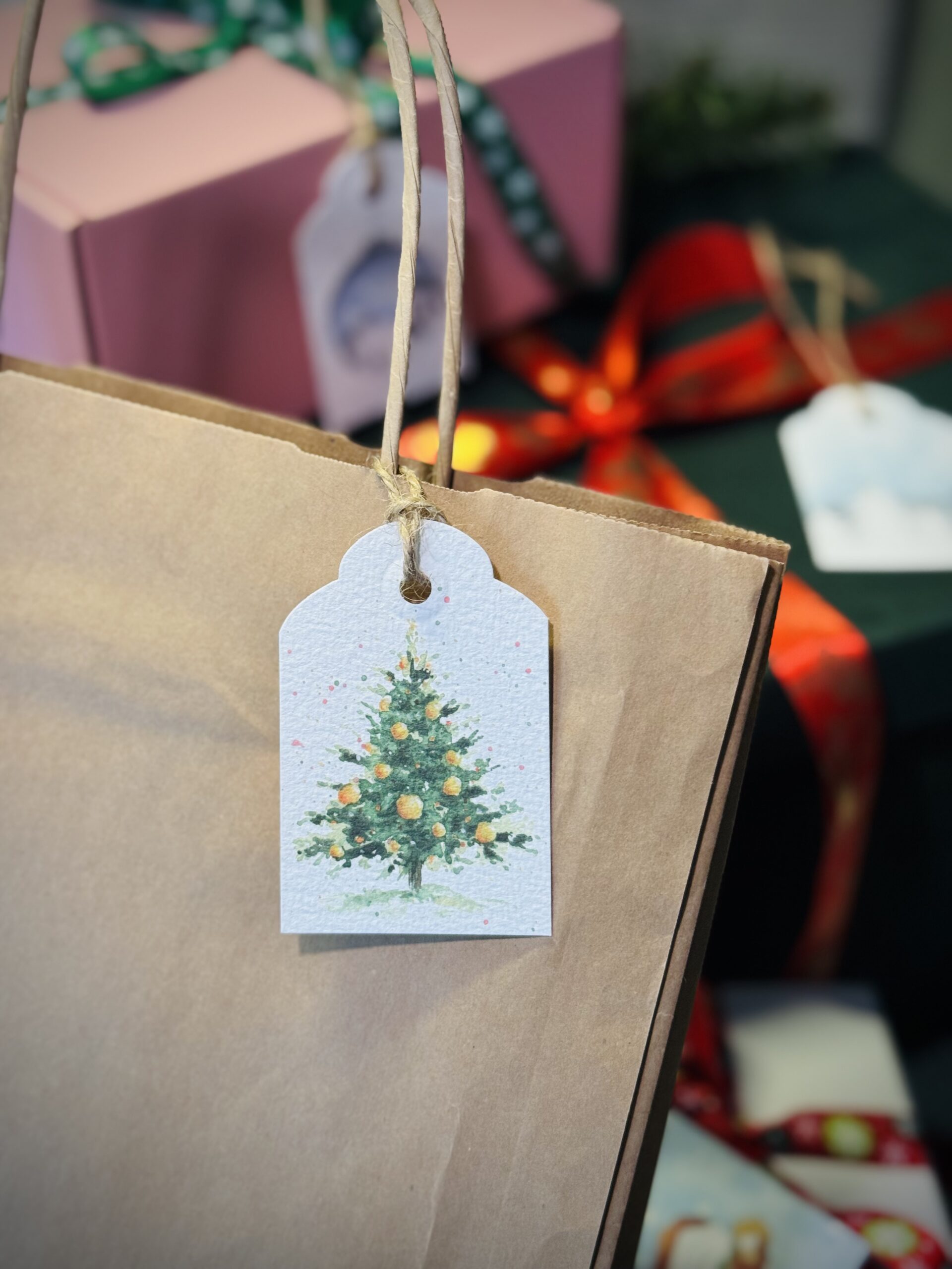 Etykietka prezentowa z choinką to mały detal, który potrafi dodać ogromu świątecznego uroku. Ta etykieta – zawieszka na prezent to delikatna karteczka z ilustracją bożonarodzeniowej choinki, przewiązana sznurkiem i ozdobiona kokardką, sprawi, że każdy prezent będzie wyglądał wyjątkowo i bardziej „od serca”. Taki bilecik do prezentu idealne miejsce, by wpisać imię obdarowanej osoby i dodać osobistą nutę magii pod choinką.