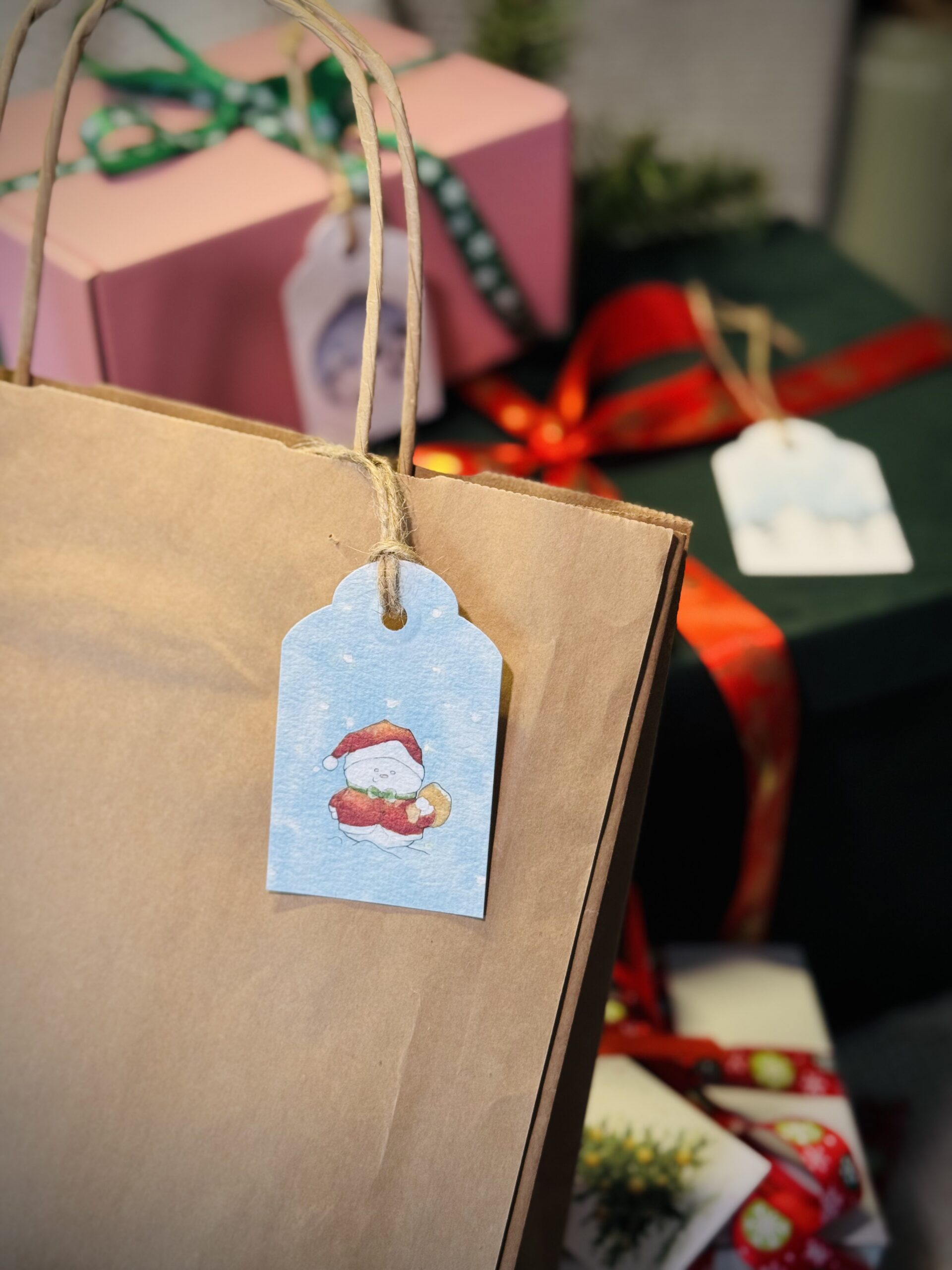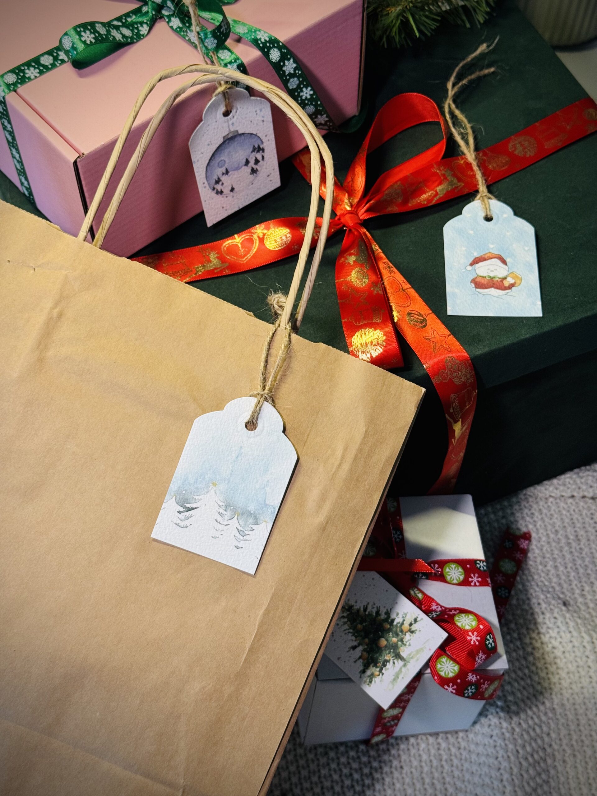 Zestaw etykietek prezentowych średni to idealny sposób, by każdy świąteczny upominek zyskał wyjątkowy charakter. W komplecie znajdują się cztery różne wzory — od choinek, przez bałwanka, po śnieżną bombkę — dzięki czemu możesz dopasować bilecik do stylu prezentu lub osoby, którą obdarowujesz. Każda etykietka posiada sznureczek, który ułatwia jej przywiązanie, i piękną ilustrację, która dodaje paczce uroku, elegancji i świątecznego klimatu.