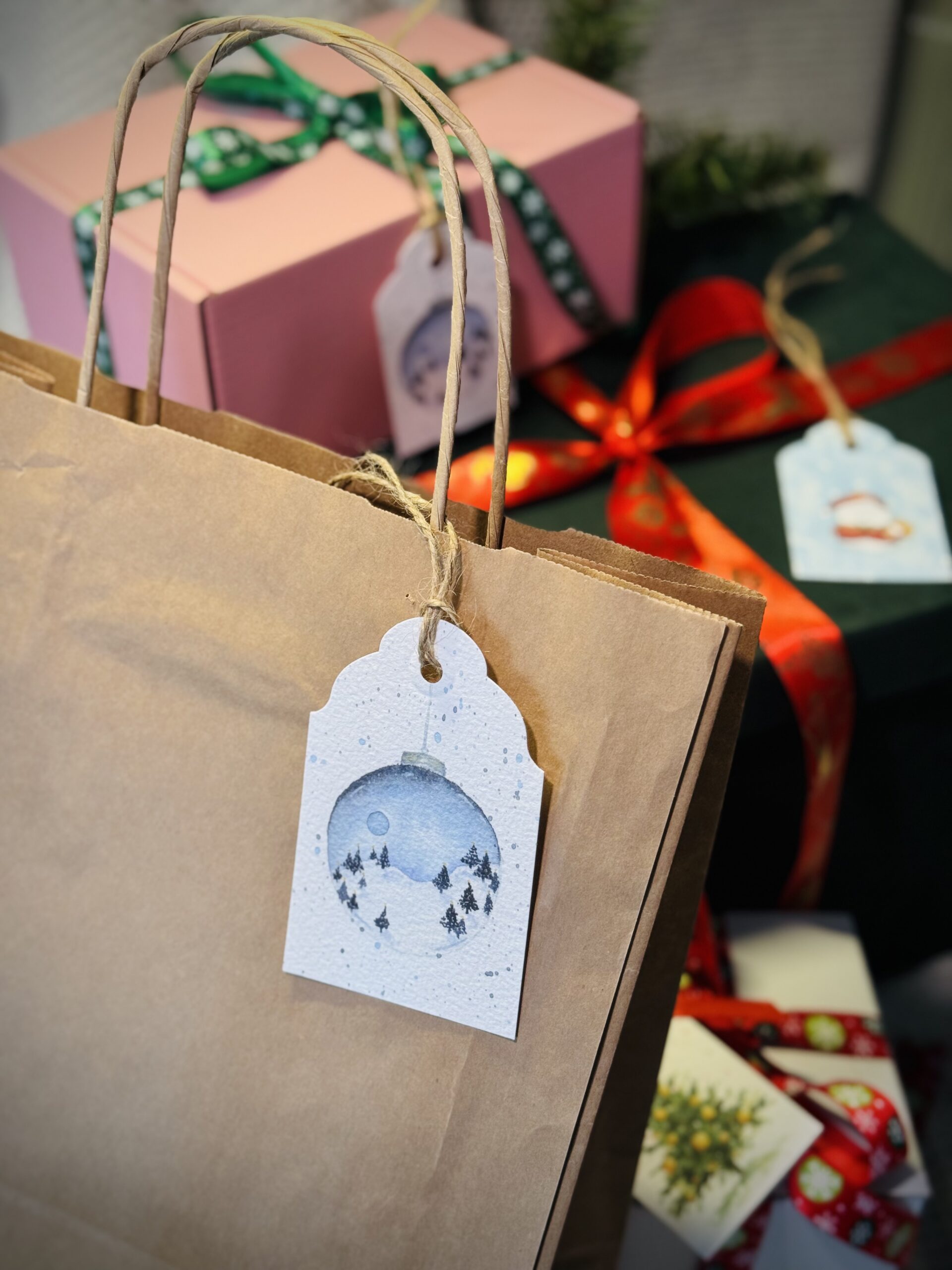 Zestaw etykietek prezentowych dużych to idealny sposób, by każdy świąteczny upominek zyskał wyjątkowy charakter. W komplecie znajdują się cztery różne wzory — od choinek, przez bałwanka, po śnieżną bombkę — dzięki czemu możesz dopasować bilecik do stylu prezentu lub osoby, którą obdarowujesz. Każda etykietka posiada sznureczek, który ułatwia jej przywiązanie, i piękną ilustrację, która dodaje paczce uroku, elegancji i świątecznego klimatu.