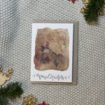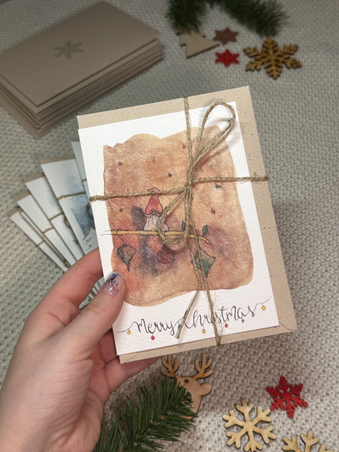 Kartka świąteczna „Krasnal na gałązce” z krasnalem siedzącym na gałązce, ozdobionej bombkami, to przytulna, pełna uroku propozycja na Boże Narodzenie. Ciepłe, brązowe tło tworzy klimat domowej magii, a uroczy krasnal dodaje kartce bajkowego charakteru. To idealny sposób, aby przekazać bliskim świąteczne życzenia pełne spokoju, radości i ciepła rodzinnego ogniska.