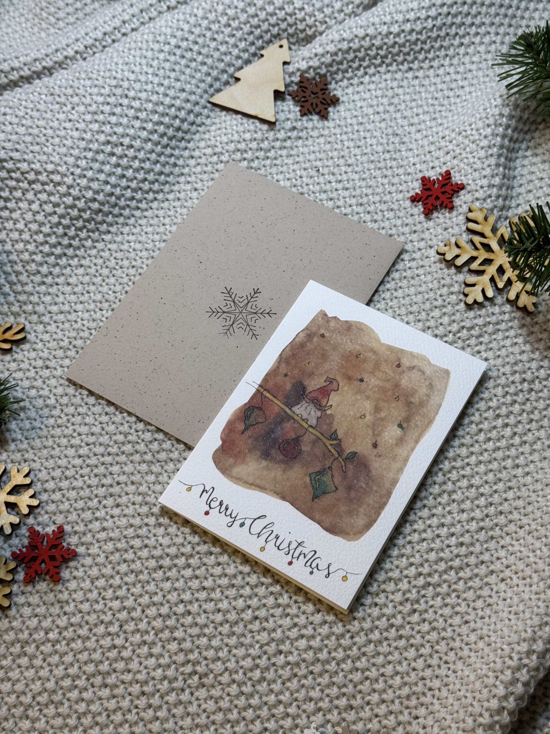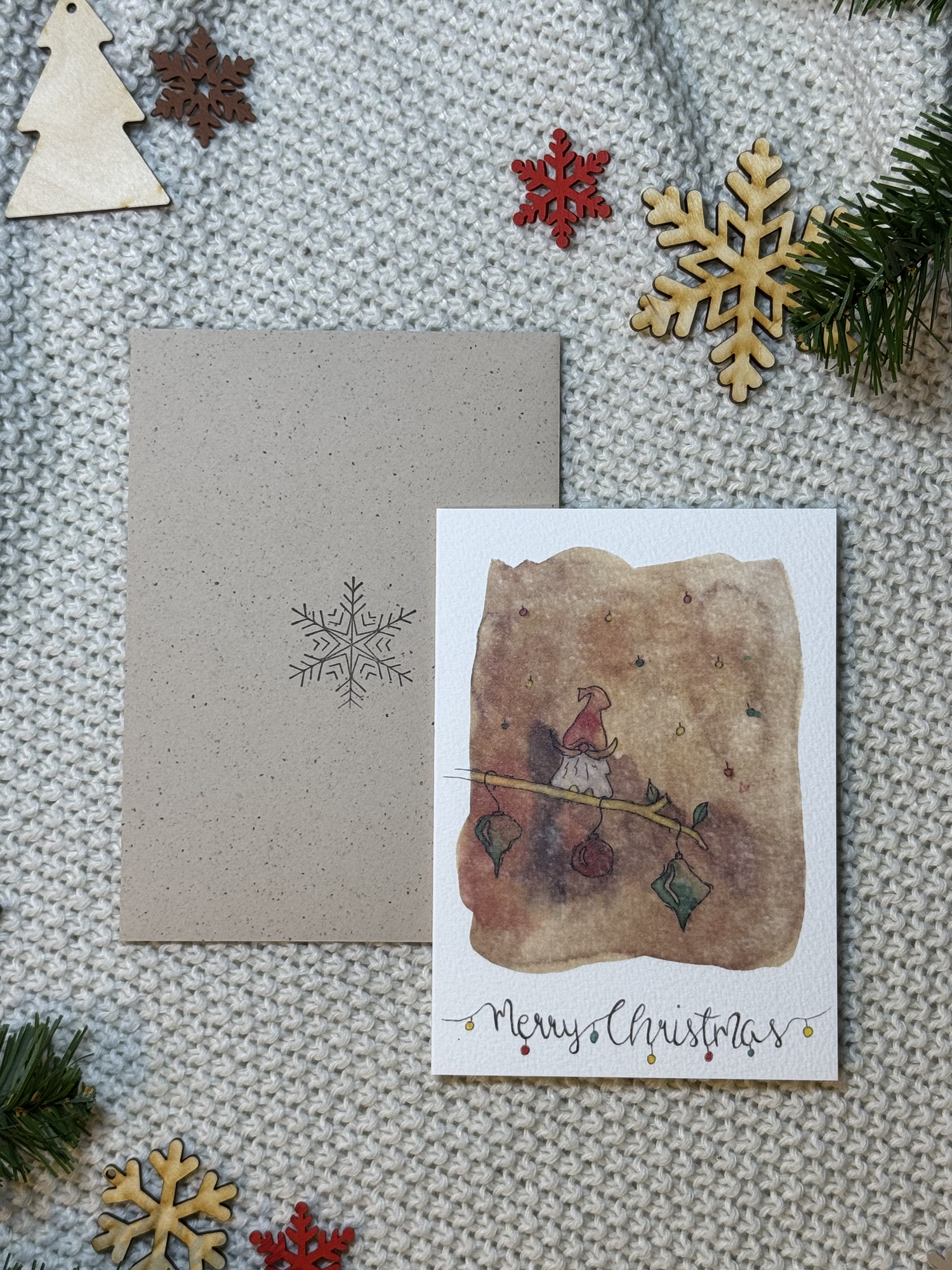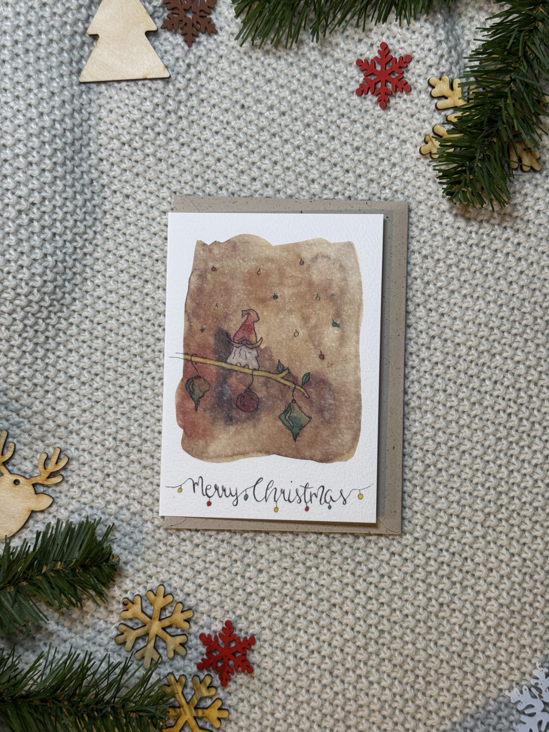 Kartka świąteczna „Krasnal na gałązce” z krasnalem siedzącym na gałązce, ozdobionej bombkami, to przytulna, pełna uroku propozycja na Boże Narodzenie. Ciepłe, brązowe tło tworzy klimat domowej magii, a uroczy krasnal dodaje kartce bajkowego charakteru. To idealny sposób, aby przekazać bliskim świąteczne życzenia pełne spokoju, radości i ciepła rodzinnego ogniska.