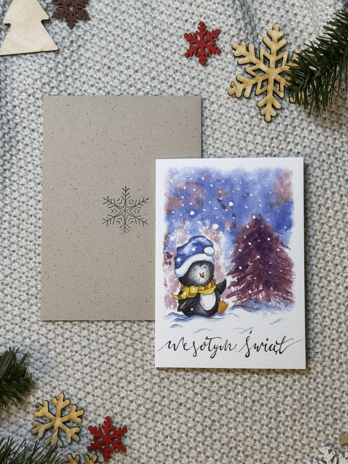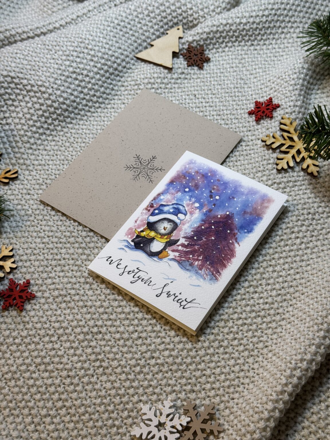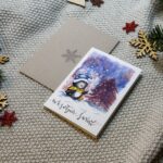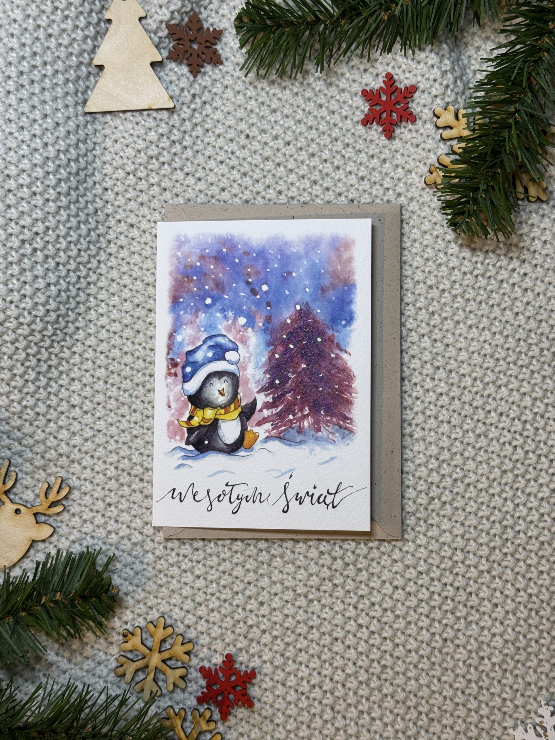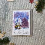 Kartka świąteczna „Wesoły pingwin” to pełna uroku, zimowa scena, która wywoła uśmiech od pierwszego spojrzenia. Mały pingwinek w czapce Mikołaja tańczy radośnie przy choince, jakby święta były jego ulubionym świętem (a wiadomo – pewnie są!). To lekka, ciepła i pogodna propozycja na Boże Narodzenie, idealna dla każdego, kto lubi świąteczne klimaty z odrobiną humoru i mnóstwem pozytywnej energii.