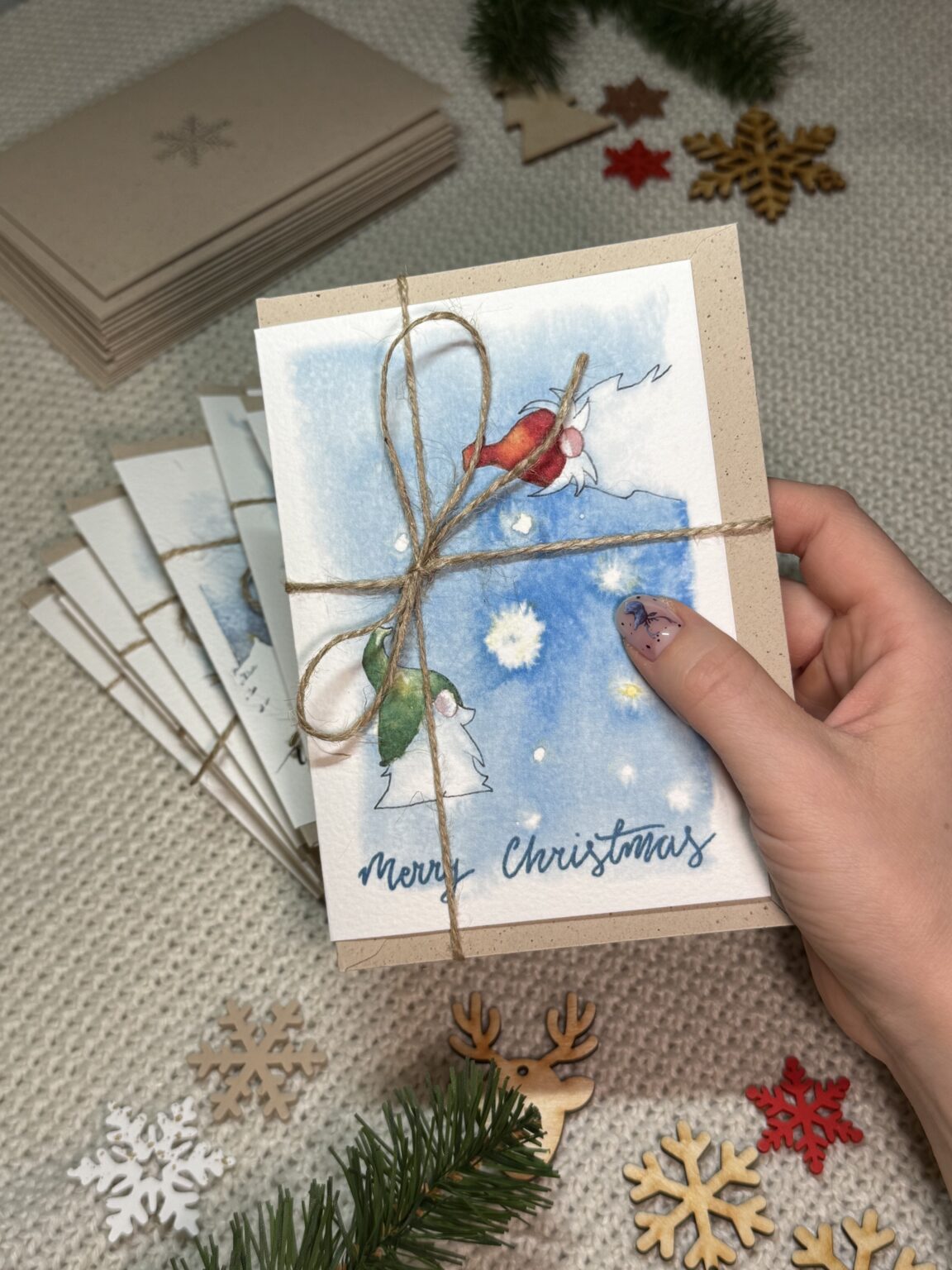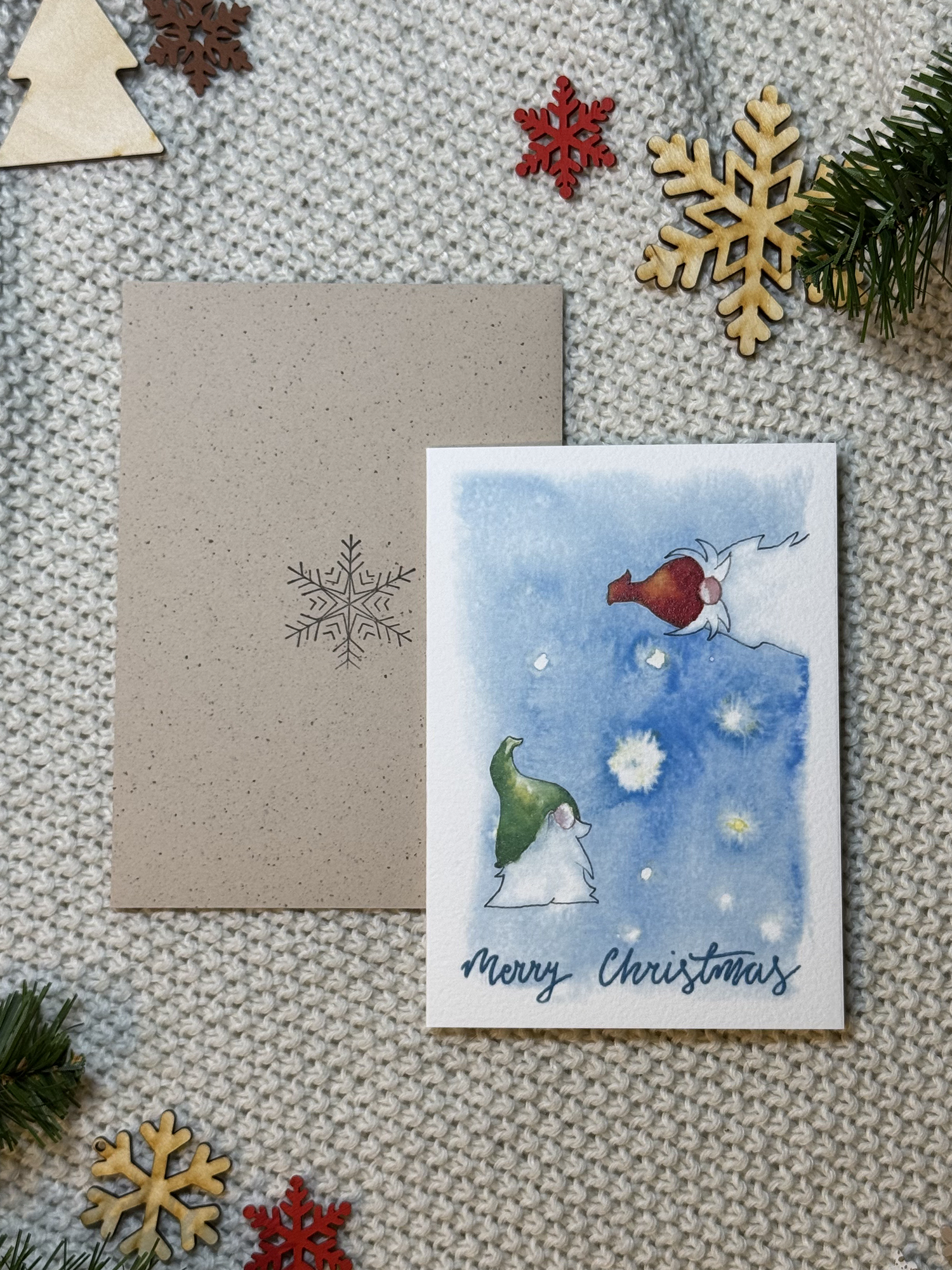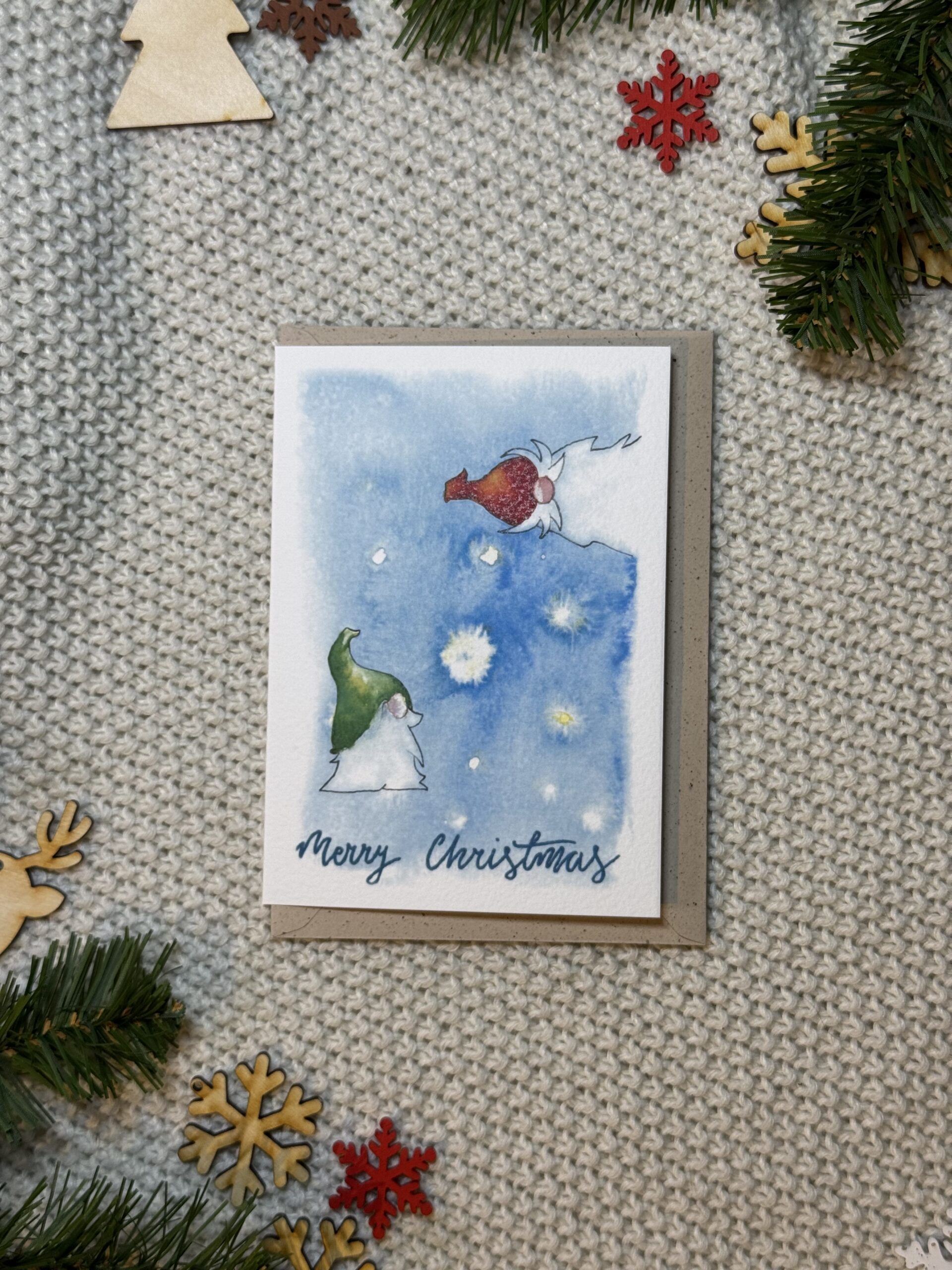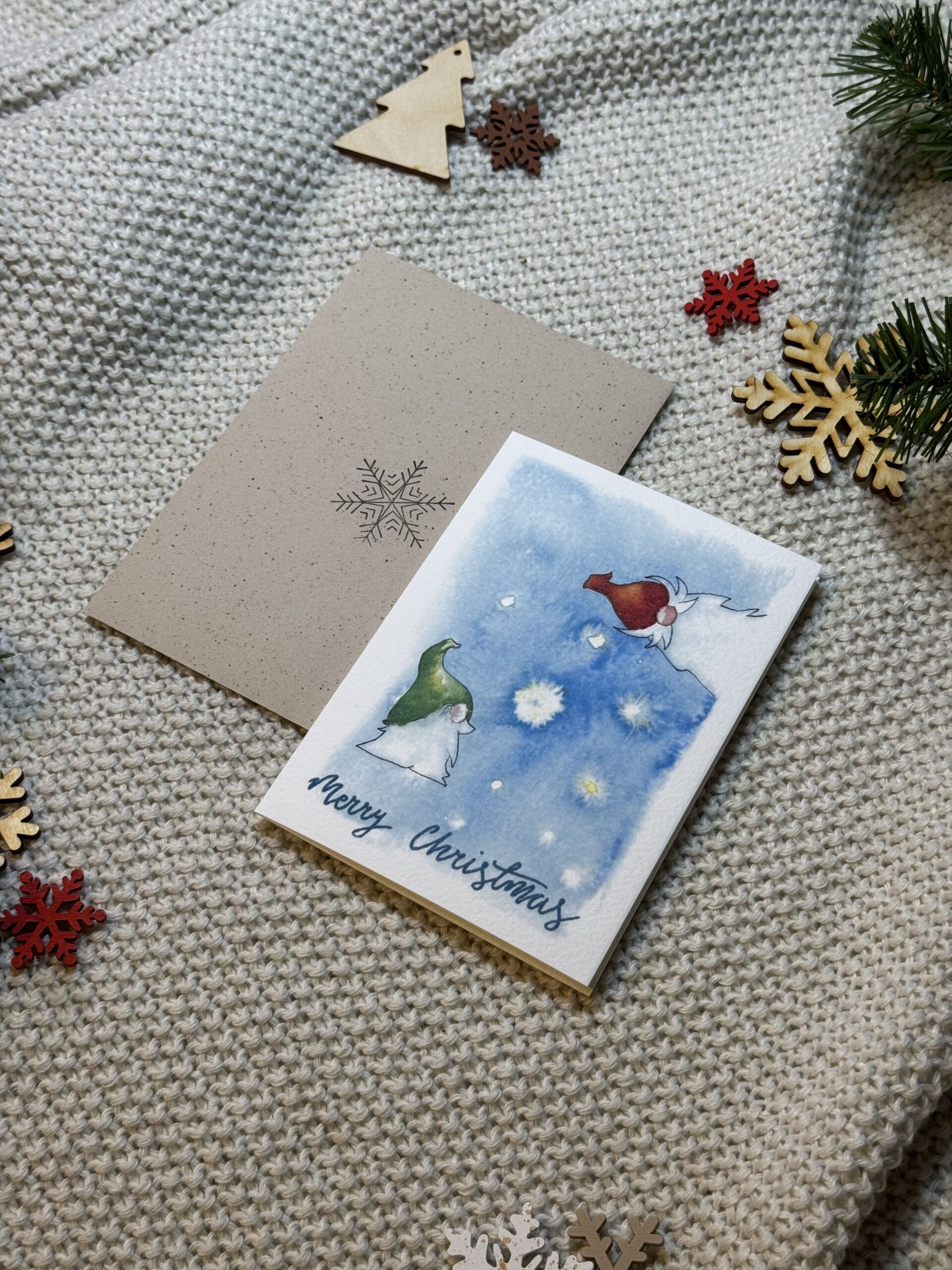 Kartka świąteczna „Świąteczne Krasnale” z dwoma uroczymi krasnalami na niebieskim tle to pełna ciepła i humoru propozycja na Boże Narodzenie. Zimowa sceneria, czapeczki naciągnięte na nos i odrobina magicznego skrzypienia śniegu sprawiają, że kartka od razu wprowadza w świąteczny nastrój. To idealny sposób, by przekazać bliskim serdeczność, radość i odrobinę bajkowej atmosfery.