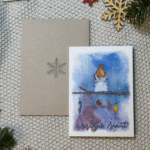 Kartka świąteczna fioletowy „Krasnal na gałązce” z krasnalem siedzącym na gałązce, ozdobionej bombkami, to przytulna, pełna uroku propozycja na Boże Narodzenie. Ciepłe, brązowe tło tworzy klimat domowej magii, a uroczy krasnal dodaje kartce bajkowego charakteru. To idealny sposób, aby przekazać bliskim świąteczne życzenia pełne spokoju, radości i ciepła rodzinnego ogniska.