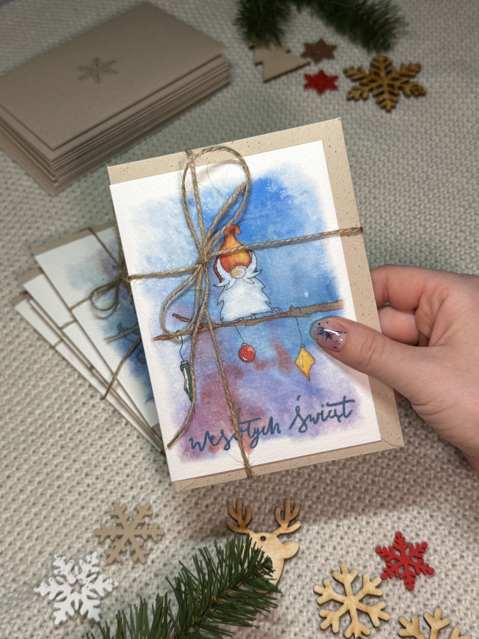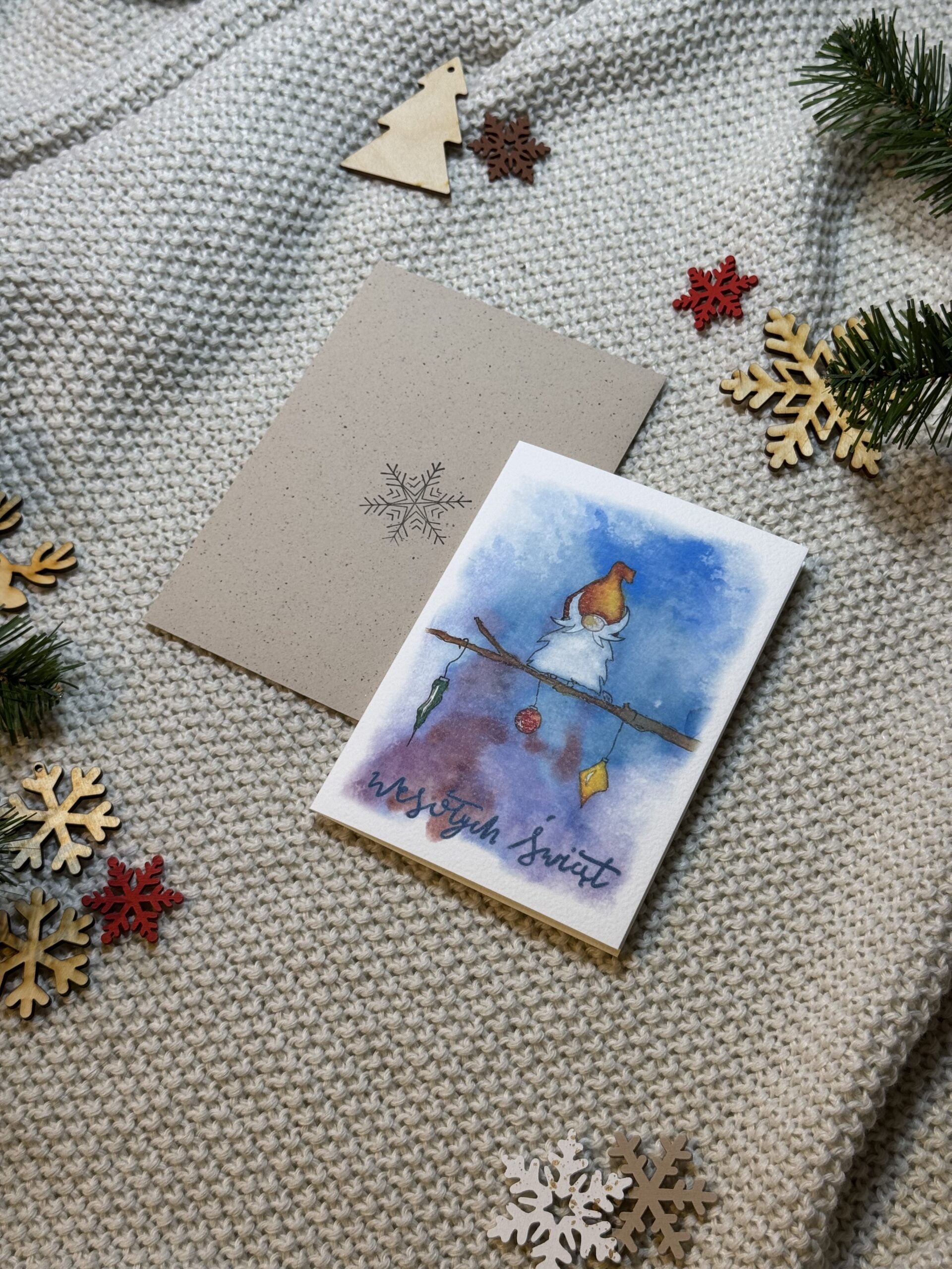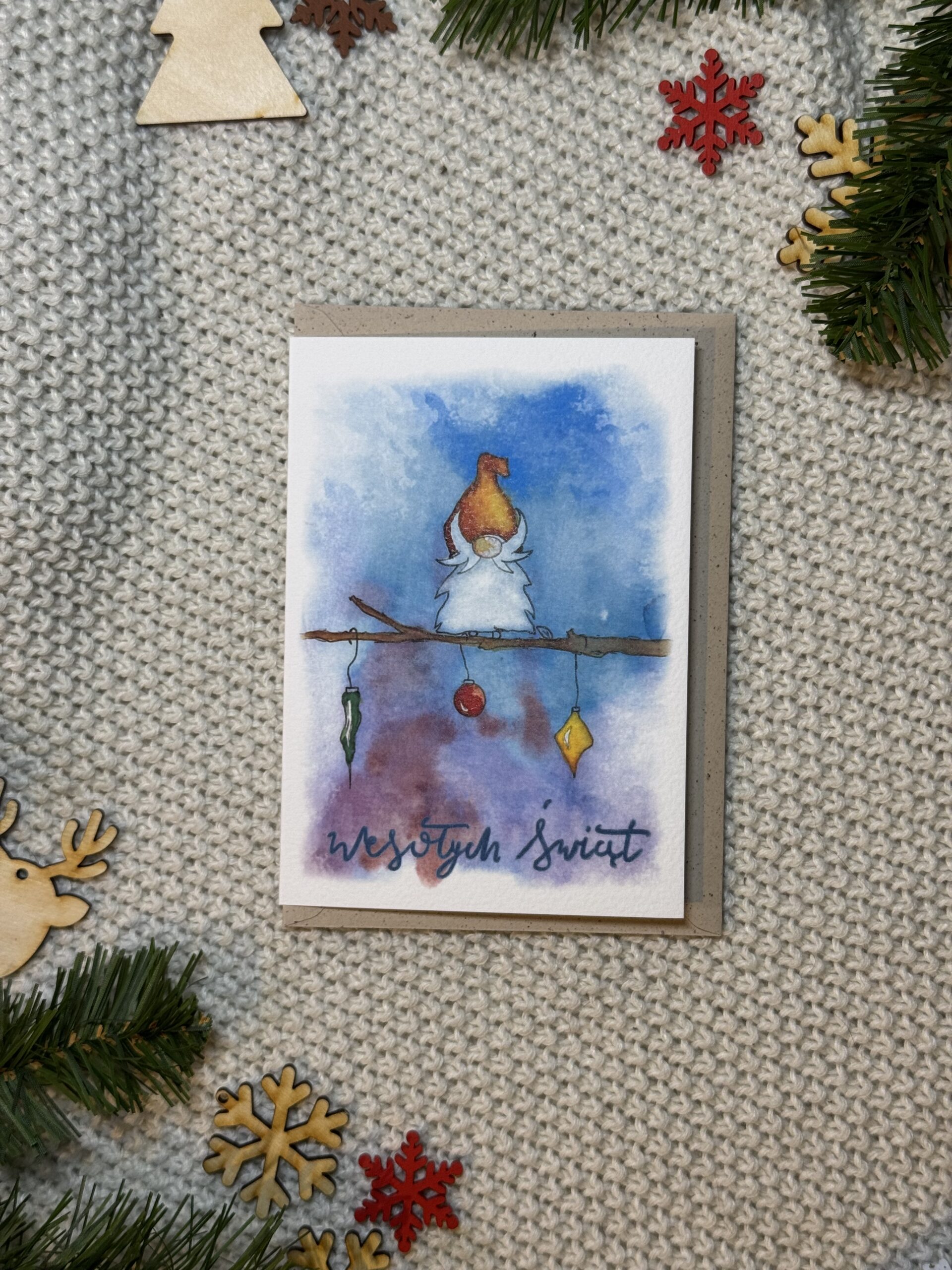 Kartka świąteczna fioletowy „Krasnal na gałązce” z krasnalem siedzącym na gałązce, ozdobionej bombkami, to przytulna, pełna uroku propozycja na Boże Narodzenie. Ciepłe, brązowe tło tworzy klimat domowej magii, a uroczy krasnal dodaje kartce bajkowego charakteru. To idealny sposób, aby przekazać bliskim świąteczne życzenia pełne spokoju, radości i ciepła rodzinnego ogniska.