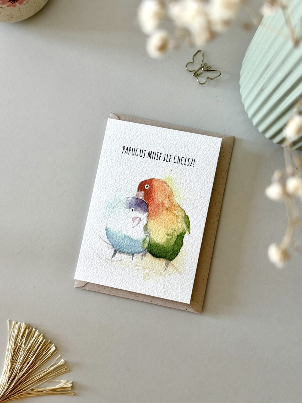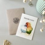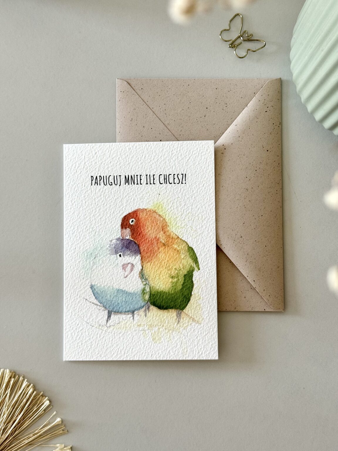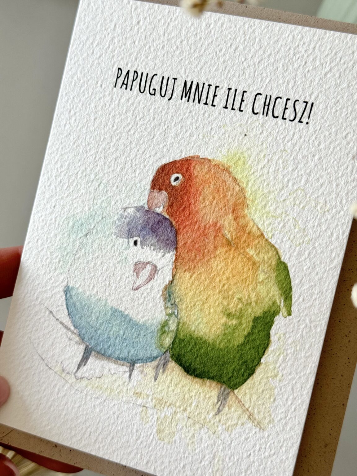 Kartka walentynkowa „Papuguj mnie ile chcesz” to kolorowa i urocza propozycja dla tych, którzy kochają z przymrużeniem oka. Dwie barwne papugi symbolizują radość, bliskość i to wyjątkowe porozumienie, które mają zakochani. Idealna kartka na Walentynki lub po prostu – żeby powiedzieć „lubię Cię tak bardzo, że możesz mnie papugować do woli”.