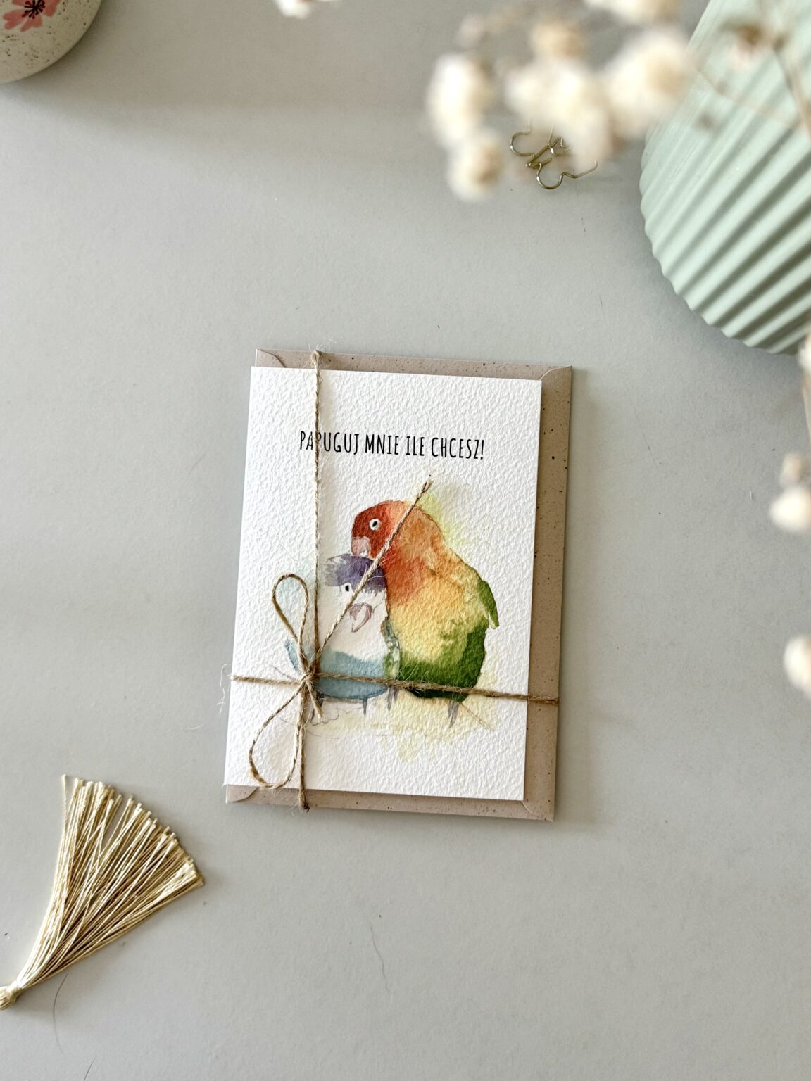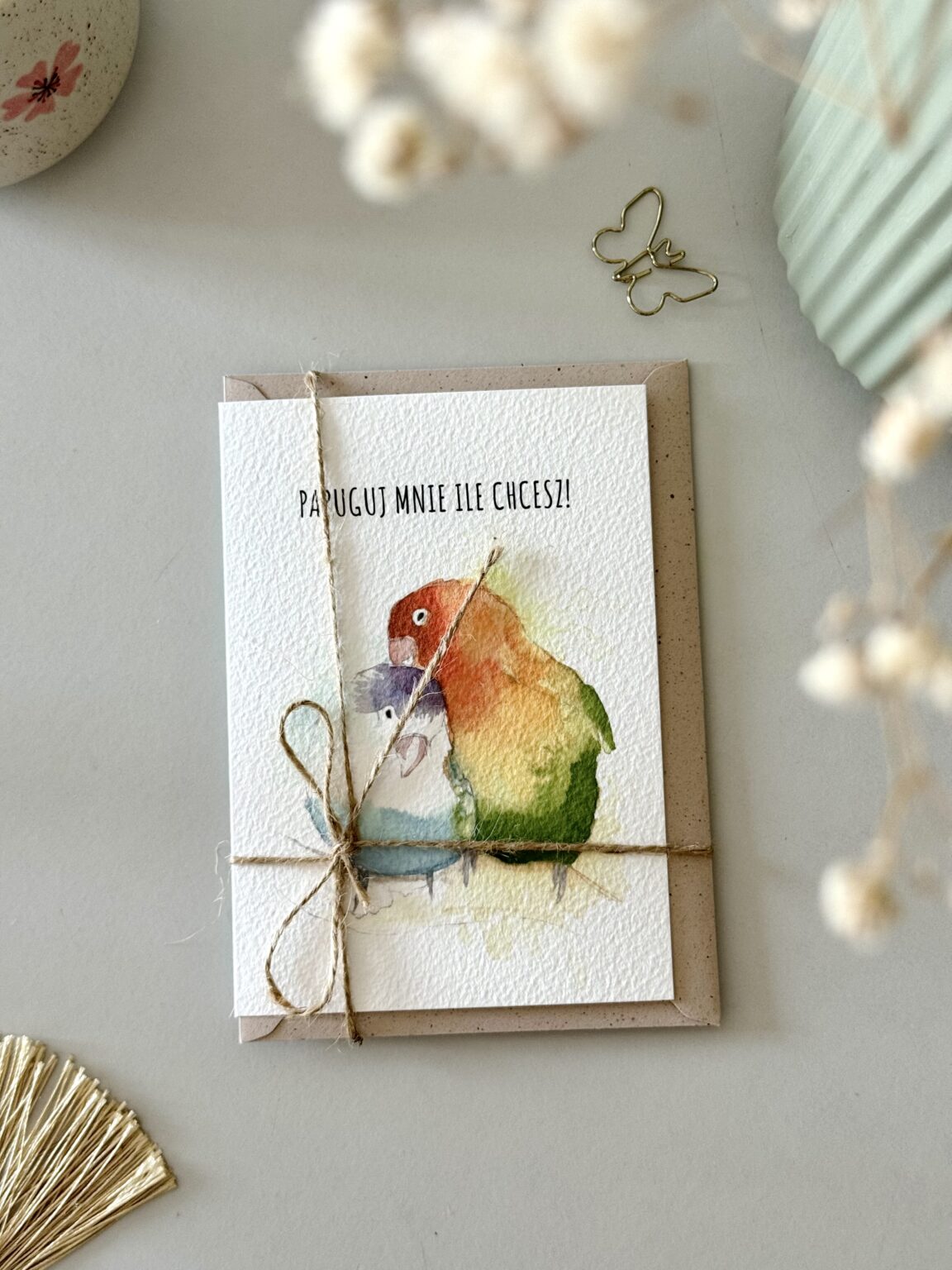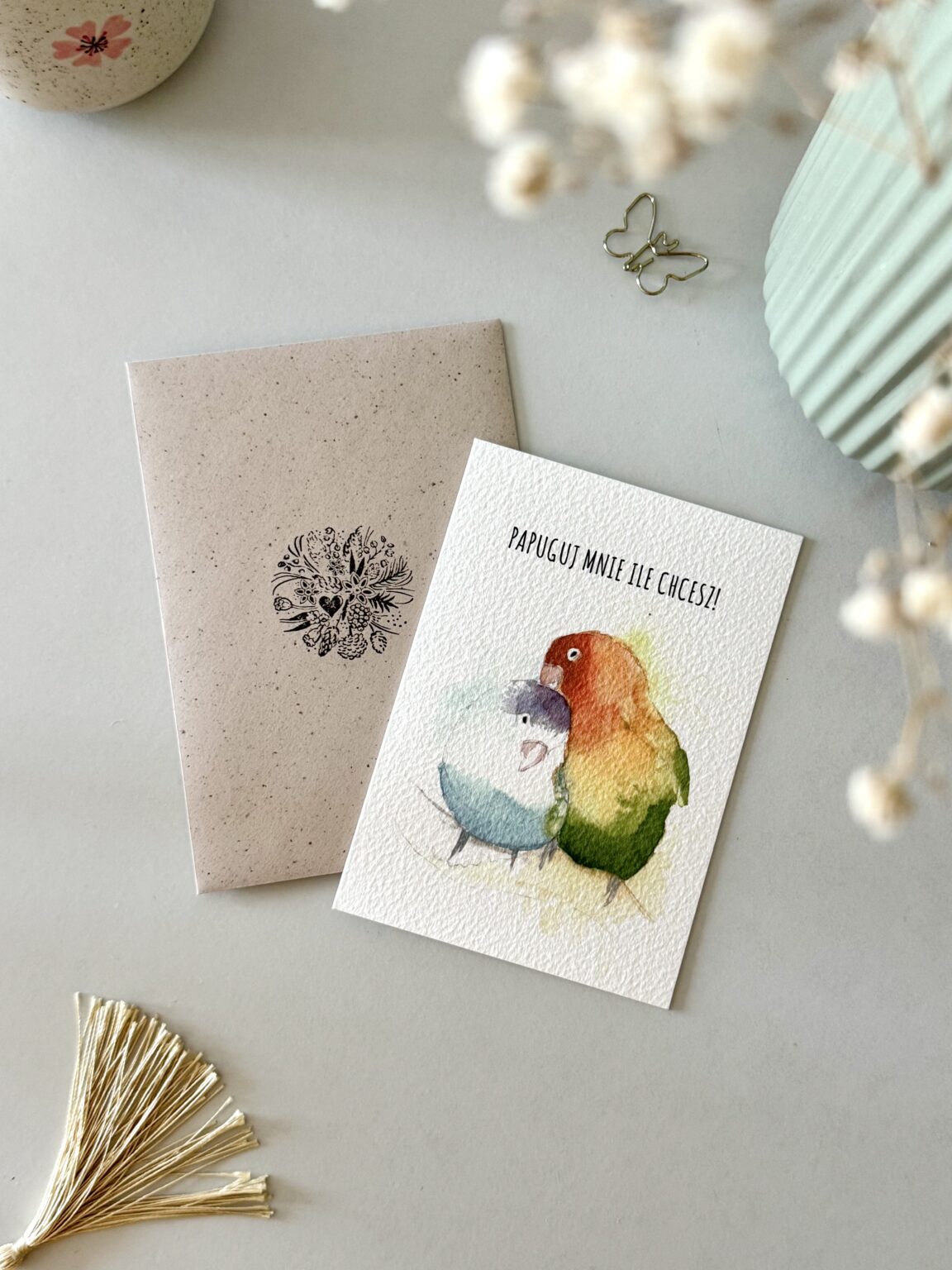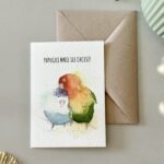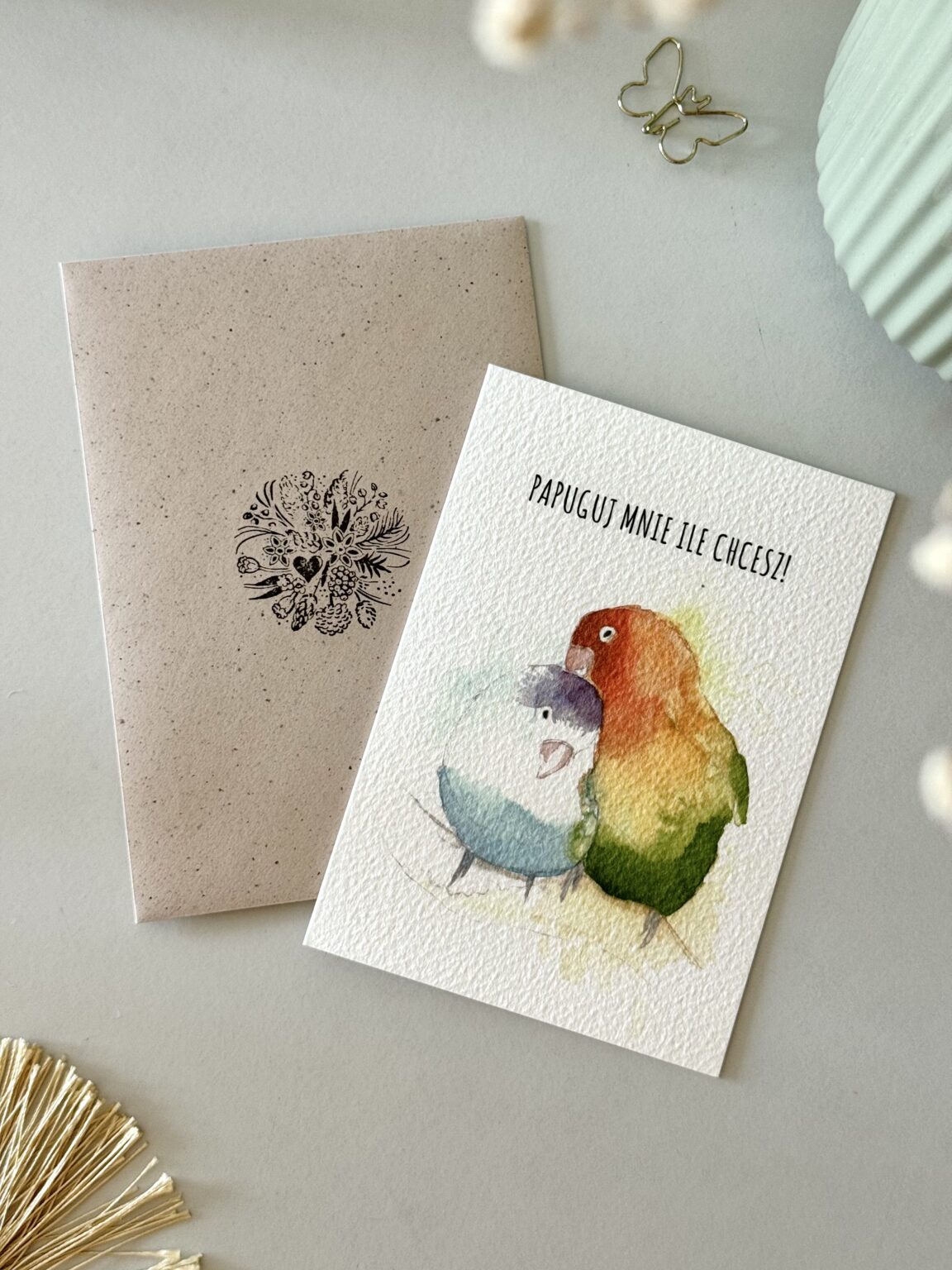 Kartka walentynkowa „Papuguj mnie ile chcesz” to kolorowa i urocza propozycja dla tych, którzy kochają z przymrużeniem oka. Dwie barwne papugi symbolizują radość, bliskość i to wyjątkowe porozumienie, które mają zakochani. Idealna kartka na Walentynki lub po prostu – żeby powiedzieć „lubię Cię tak bardzo, że możesz mnie papugować do woli”.