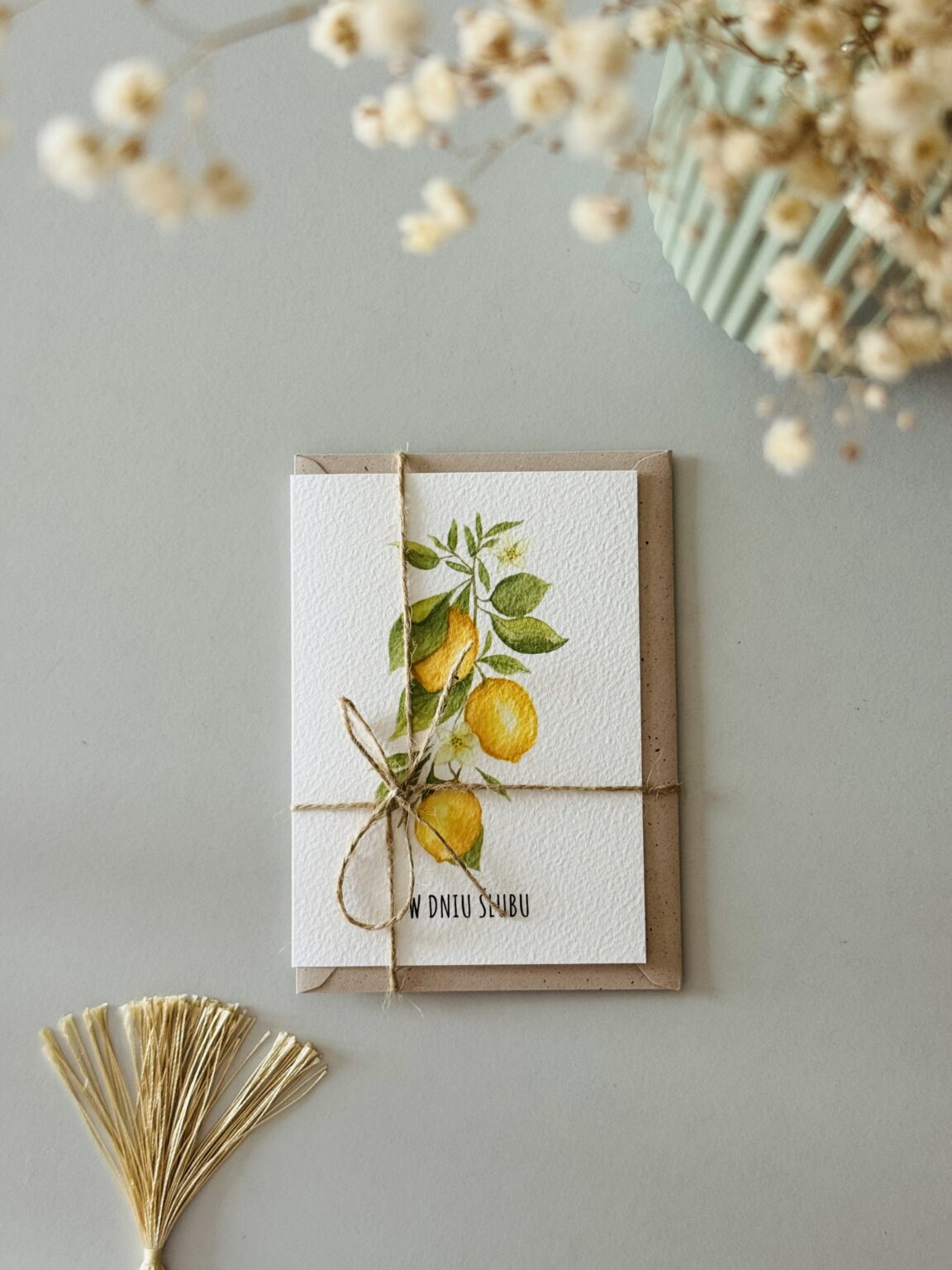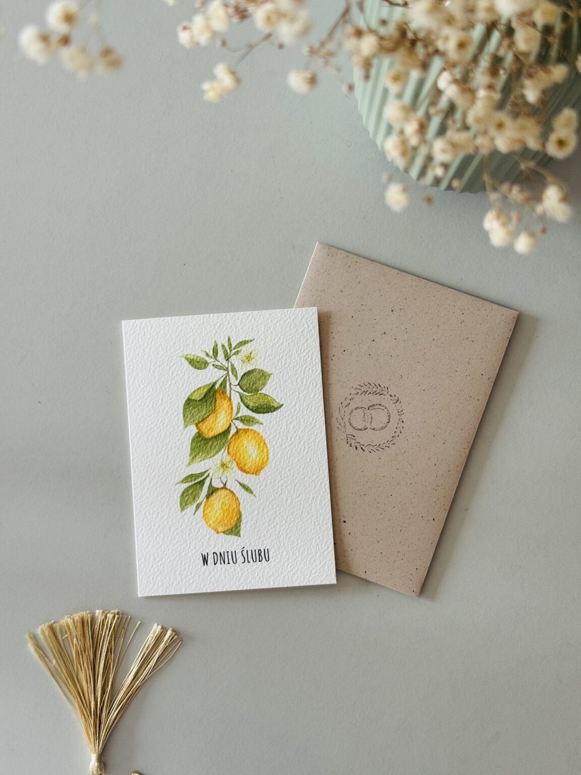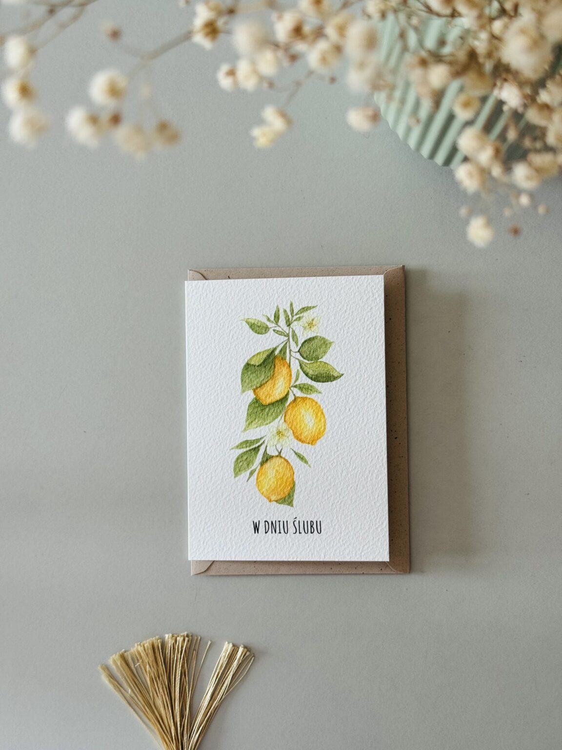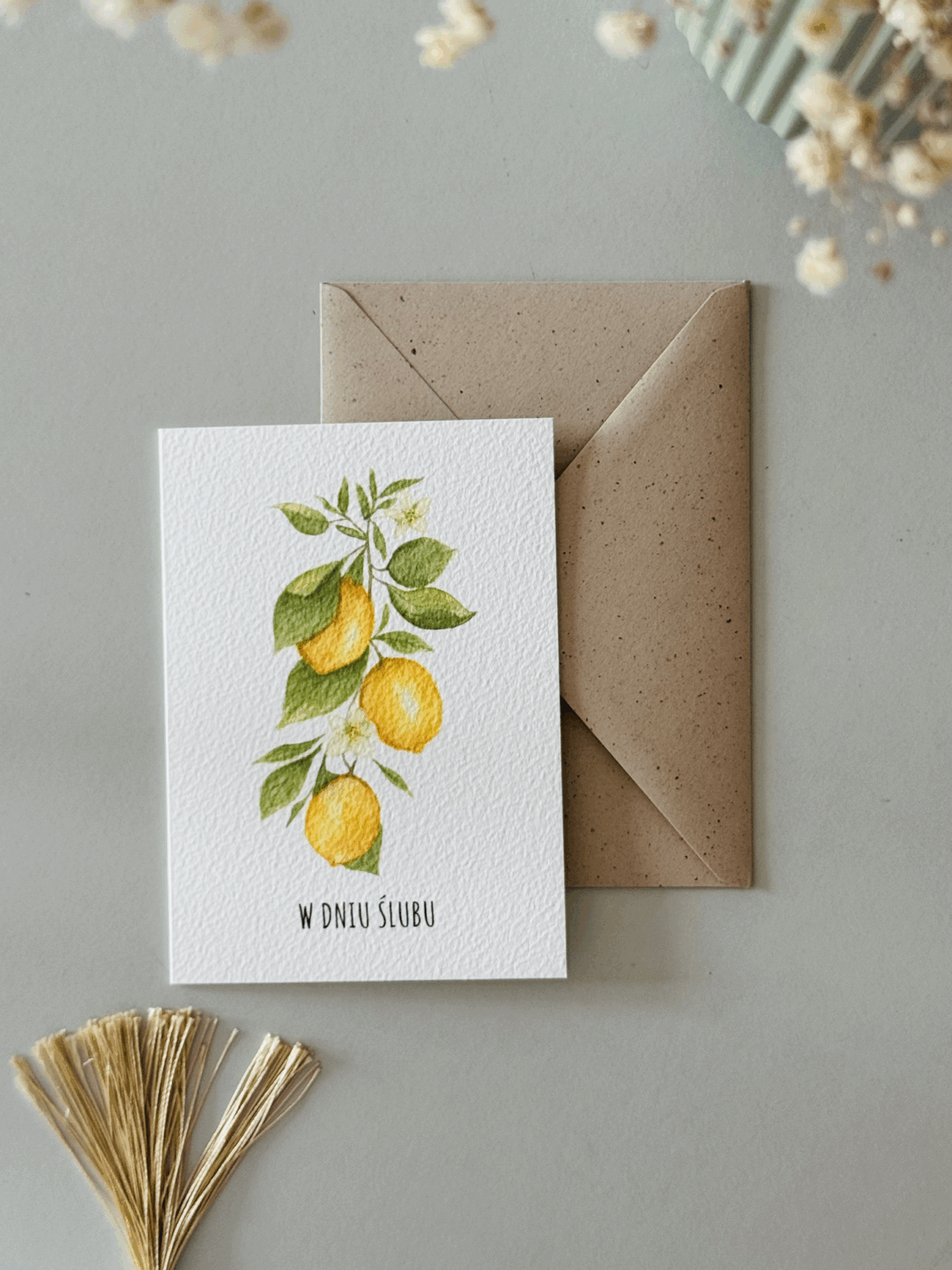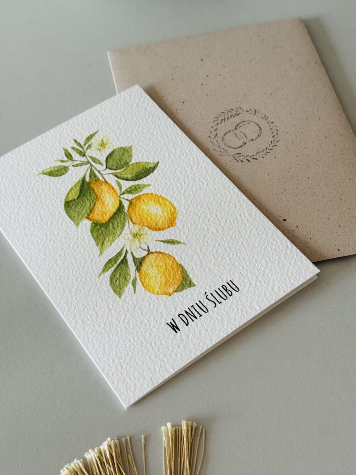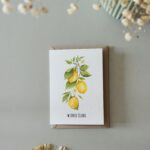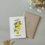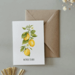 Kartka ślubna „Cytryny – gałązka” z gałązką cytryn to świeży, słoneczny akcent dla zakochanych. Inspirowana włoskim klimatem w stylu La Dolce Vita – pełna lekkości, elegancji i radości życia. Idealna dla pary młodej, która kocha podróże, śródziemnomorskie krajobrazy i wyjątkowy styl. Ta kartka mówi: „niech Wasze wspólne życie będzie jak lato we Włoszech – soczyste, piękne i pełne miłości!”