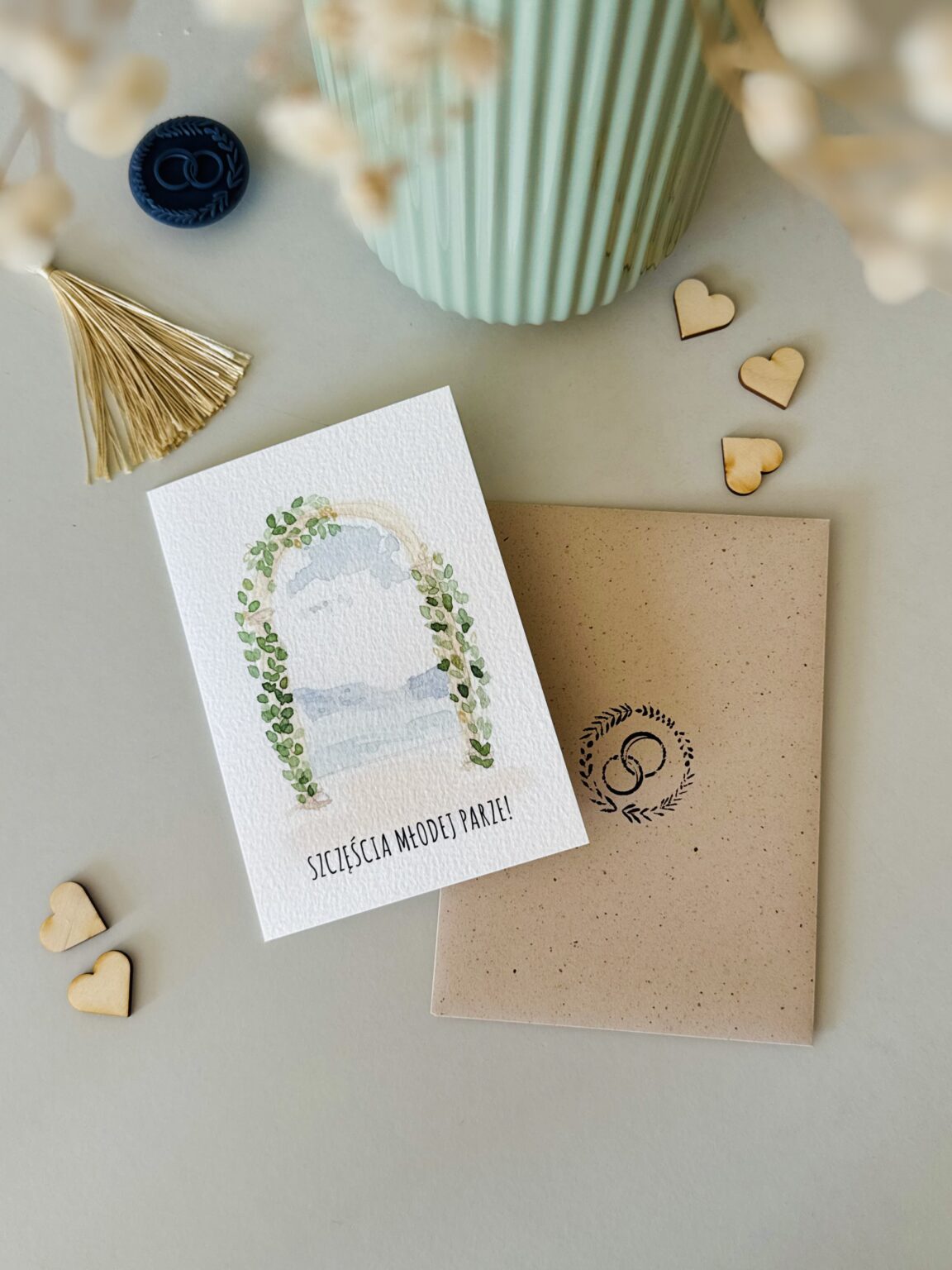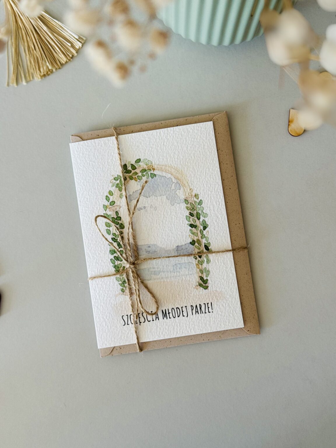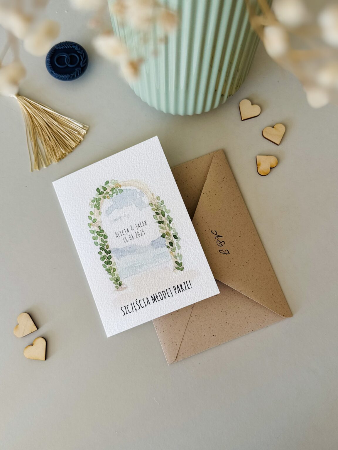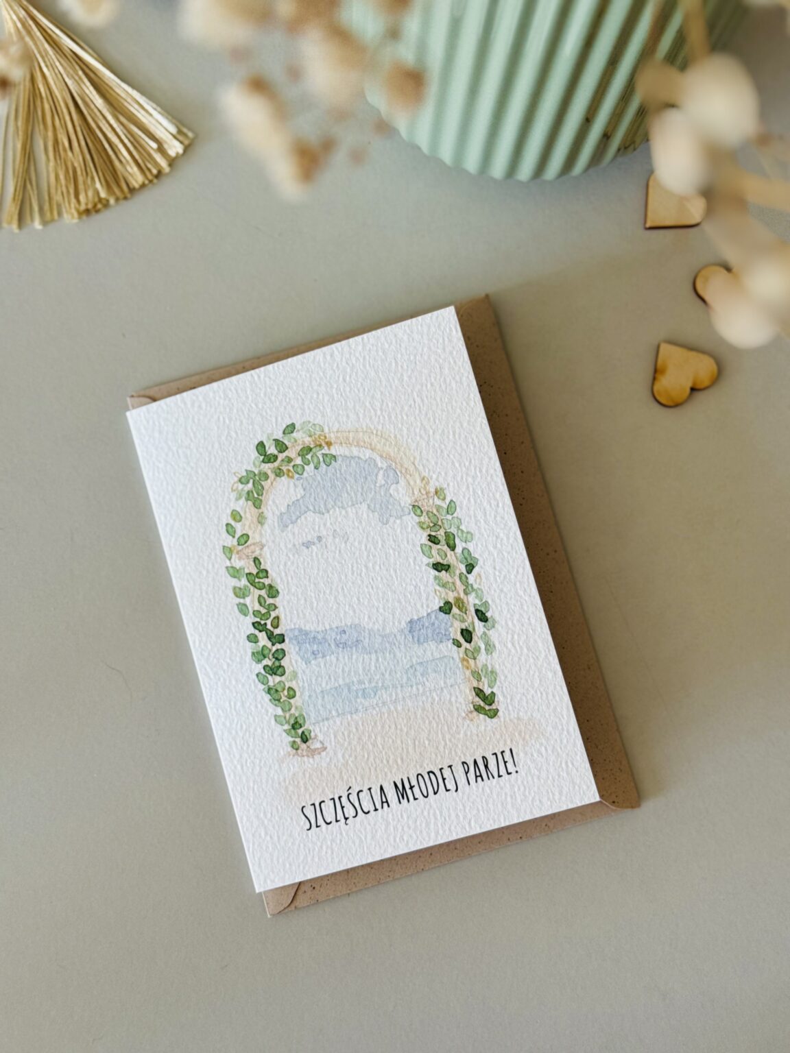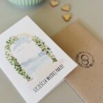 Kartka ślubna „Łuk weselny” z motywem architektonicznego łuku, ozdobionego gałązkami eukaliptusa, to wyjątkowa propozycja dla par, które marzą o romantycznym ślubie w naturze. W tle widać plażę i morze – symbol lekkości, świeżości i wspólnej drogi ku nowym przygodom. To kartka, która idealnie oddaje atmosferę letniego wesela i będzie piękną pamiątką dla nowożeńców ceniących elegancję w subtelnej, pastelowej formie.