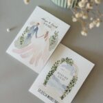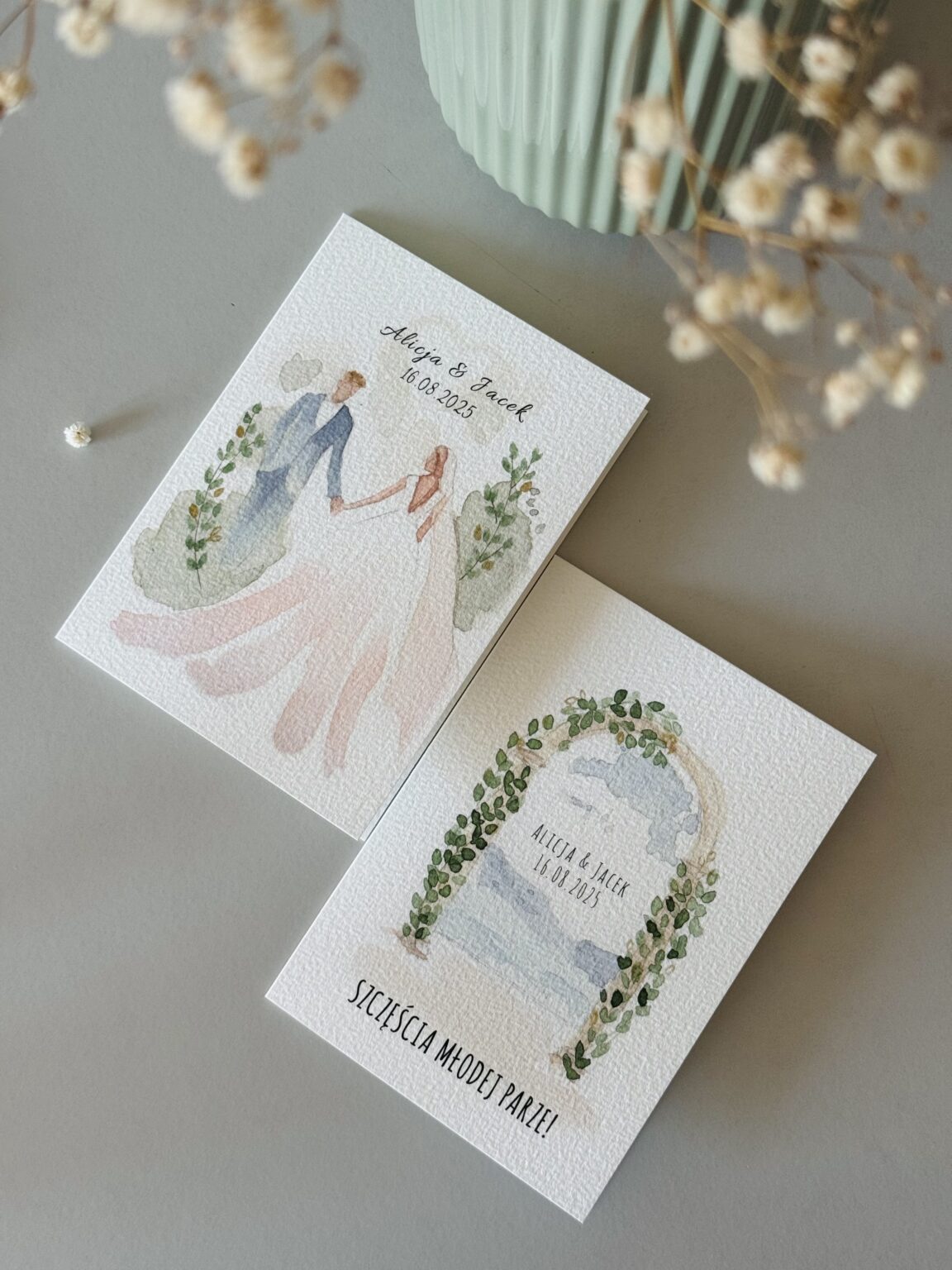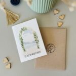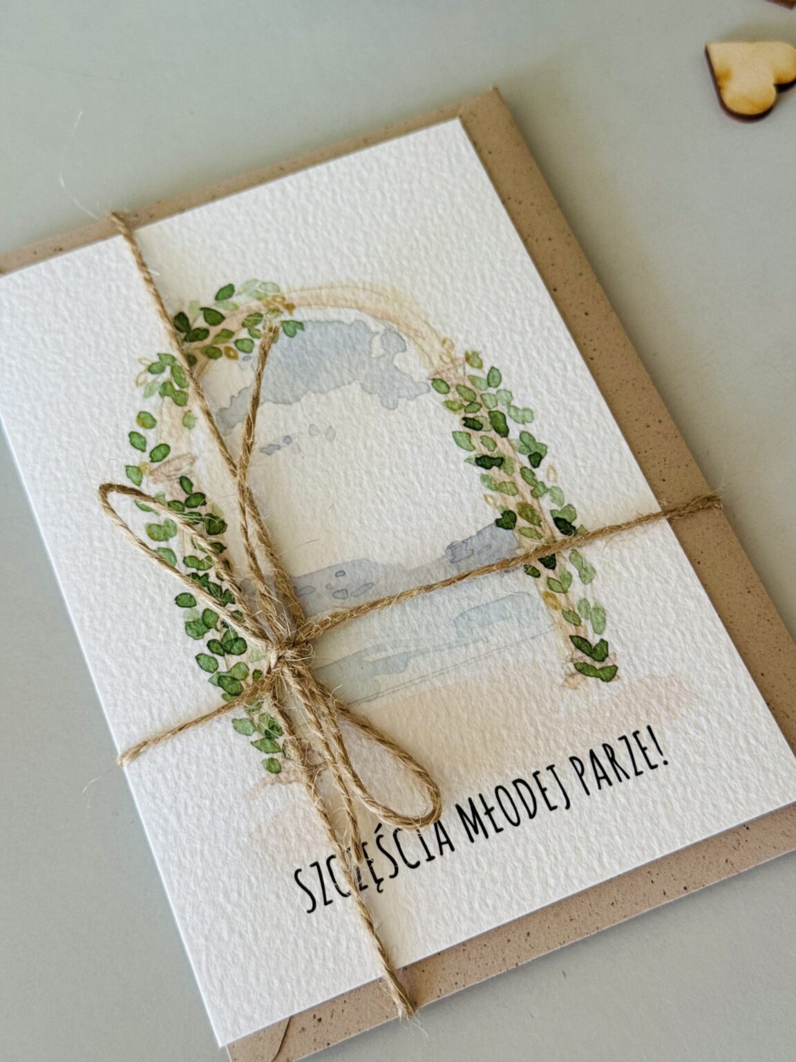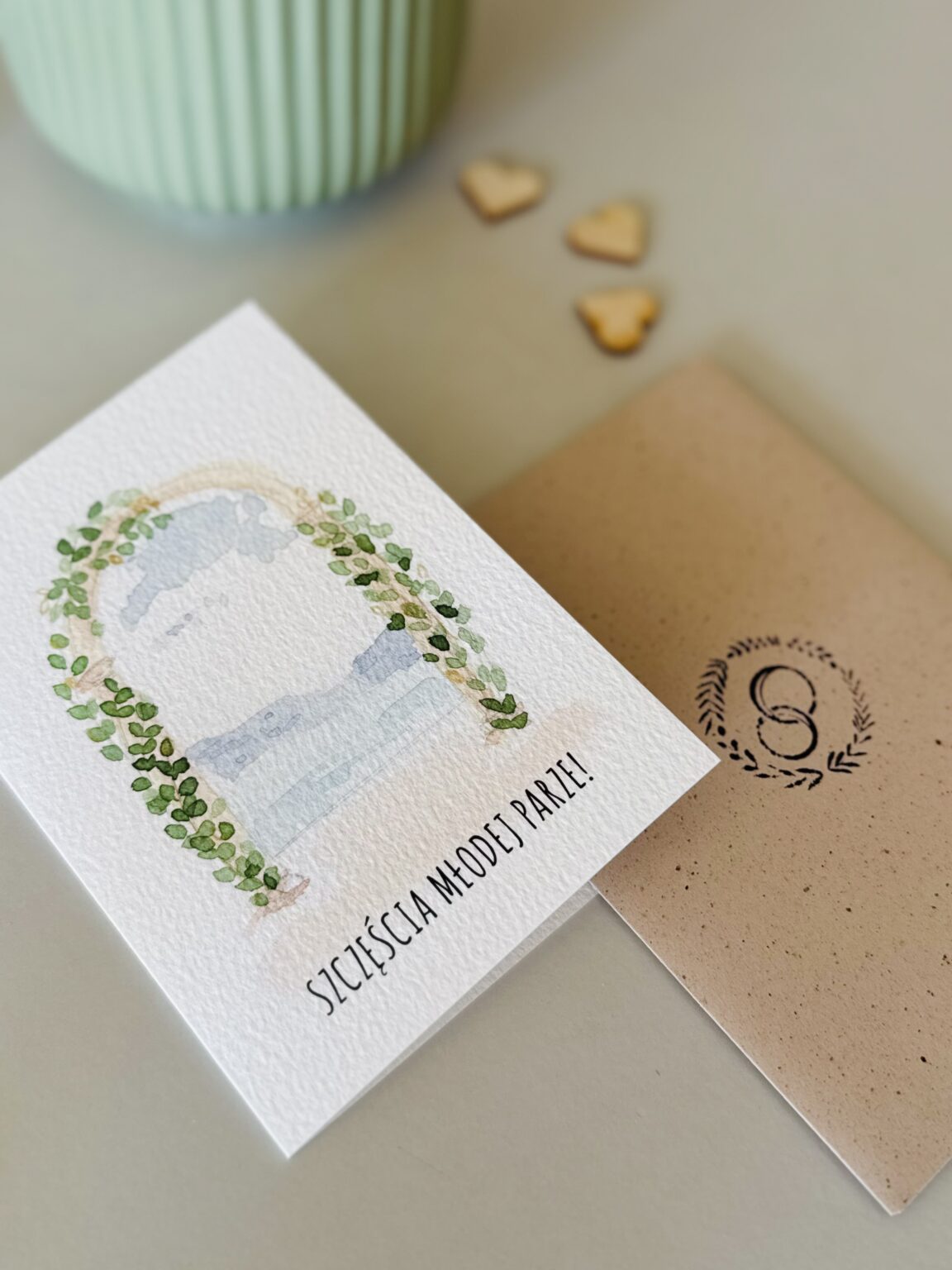 Kartka ślubna „Łuk weselny” z motywem architektonicznego łuku, ozdobionego gałązkami eukaliptusa, to wyjątkowa propozycja dla par, które marzą o romantycznym ślubie w naturze. W tle widać plażę i morze – symbol lekkości, świeżości i wspólnej drogi ku nowym przygodom. To kartka, która idealnie oddaje atmosferę letniego wesela i będzie piękną pamiątką dla nowożeńców ceniących elegancję w subtelnej, pastelowej formie.