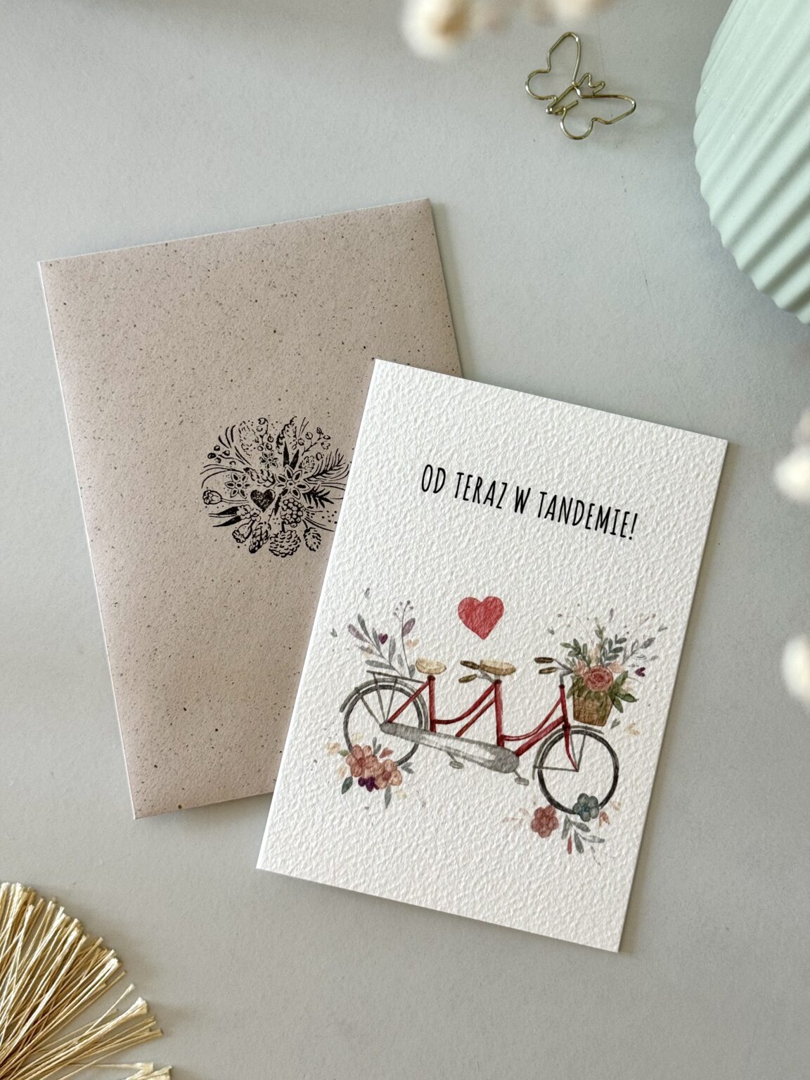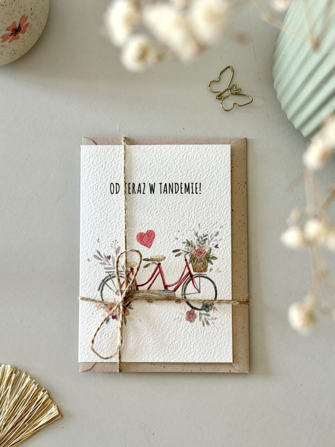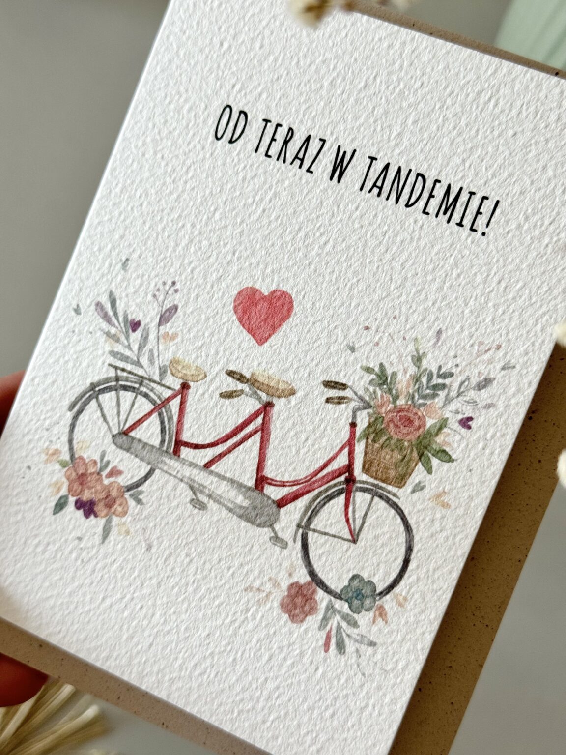 Kartka ślubna „Od teraz w tandemie” to pełna uroku i symboliki opowieść o wspólnej drodze przez życie. Czerwony rower tandemowy, ozdobiony kwiatami w stylu boho, mówi wszystko – od teraz razem, ramię w ramię, na dobre i na złe. Ta kartka to doskonały wybór na ślub – lekka, romantyczna i z charakterem, który zapada w pamięć.