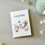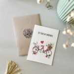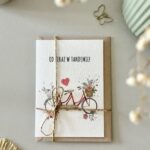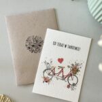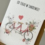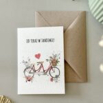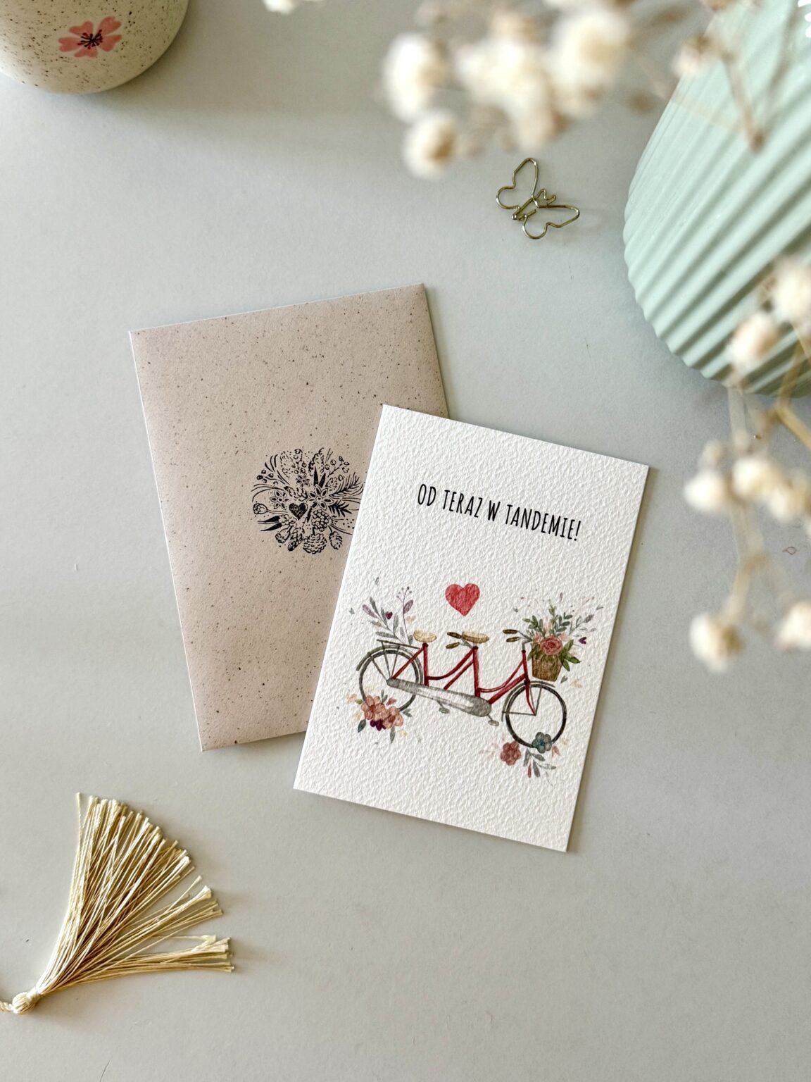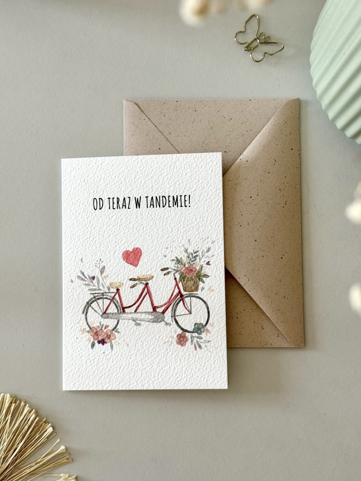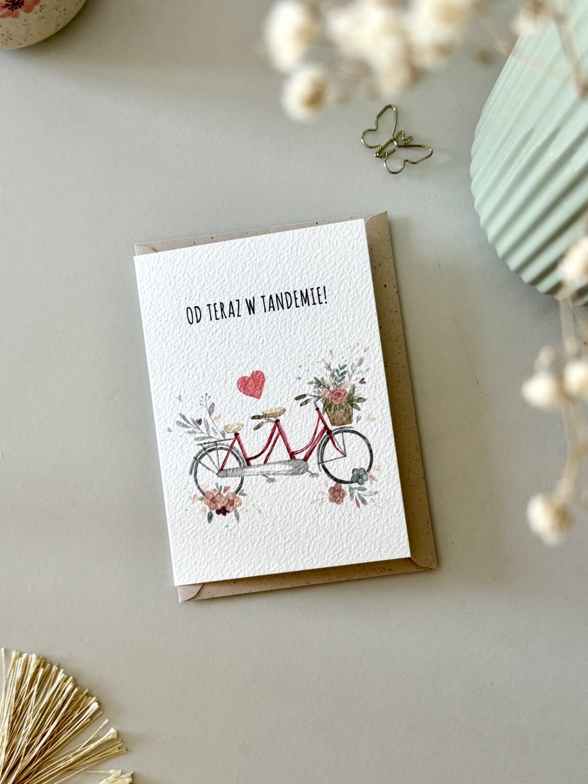 Kartka ślubna „Od teraz w tandemie” to pełna uroku i symboliki opowieść o wspólnej drodze przez życie. Czerwony rower tandemowy, ozdobiony kwiatami w stylu boho, mówi wszystko – od teraz razem, ramię w ramię, na dobre i na złe. Ta kartka to doskonały wybór na ślub – lekka, romantyczna i z charakterem, który zapada w pamięć.