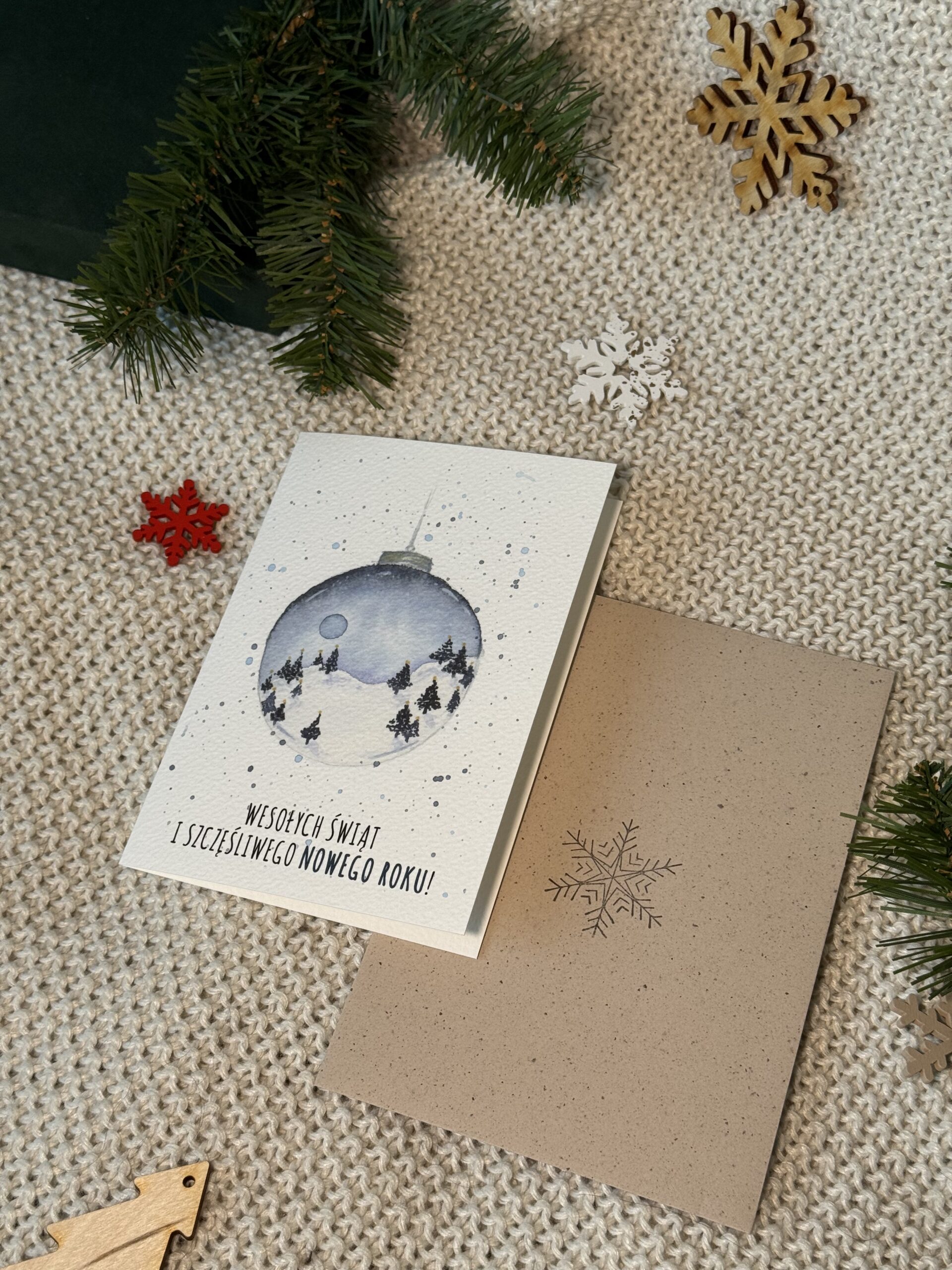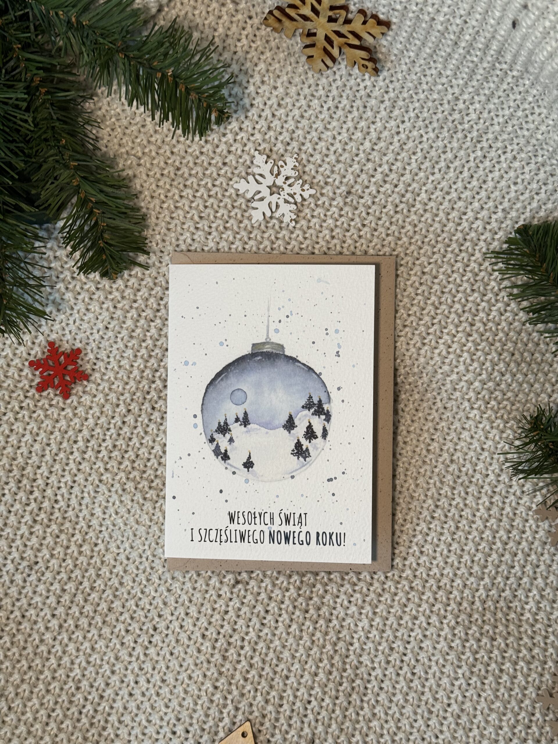 Kartka świąteczna „Śnieżna bombka” przenosi prosto do zimowej baśni — w środku szklanej bombki kryje się maleńki, śnieżny krajobraz, jak uchwycony w bezczasowej chwili magii. Padający śnieg, zimowe detale i delikatny blask sprawiają, że kartka wygląda jak miniaturowa świąteczna ozdoba, którą można przesłać bliskim. To pełna uroku, klimatyczna kartka z życzeniami „Wesołych Świąt i Szczęśliwego Nowego Roku”, idealna dla miłośników zimy, światełek i nastrojowych dekoracji.